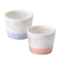 光をとおして文様が浮かび上がる蛍手(ほたるで)陶器。蛍手とは:透彫(すかしぼり)にした後、透明釉をその子穴に充填して焼成する技法。
