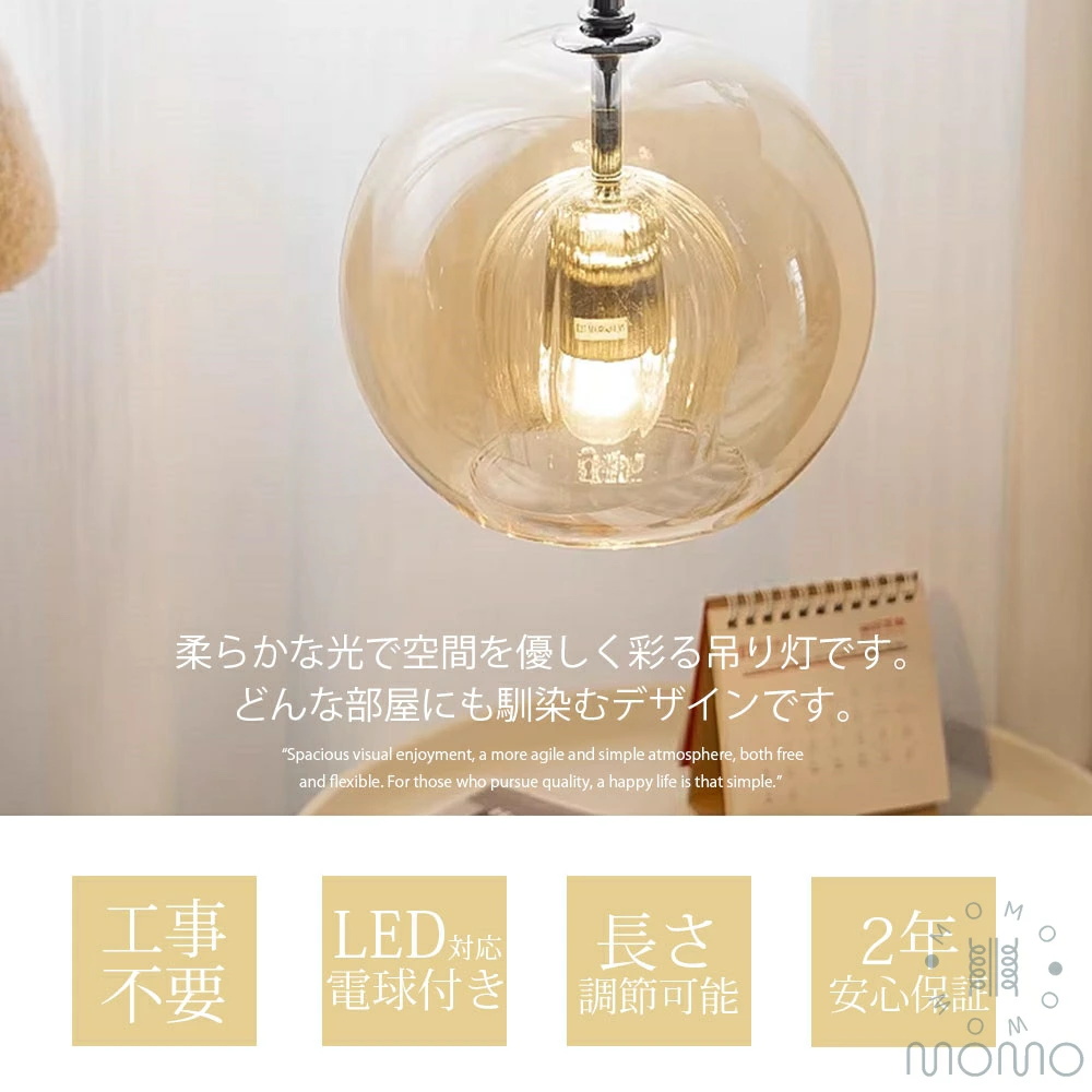 ペンダントライト LED電球付き 工事不要 長さ調節可能 手吹きクリアガラス 球形 北欧風 モダン 1灯 ダイニング リビング キッチン 引掛けシーリング対応 PSE認証