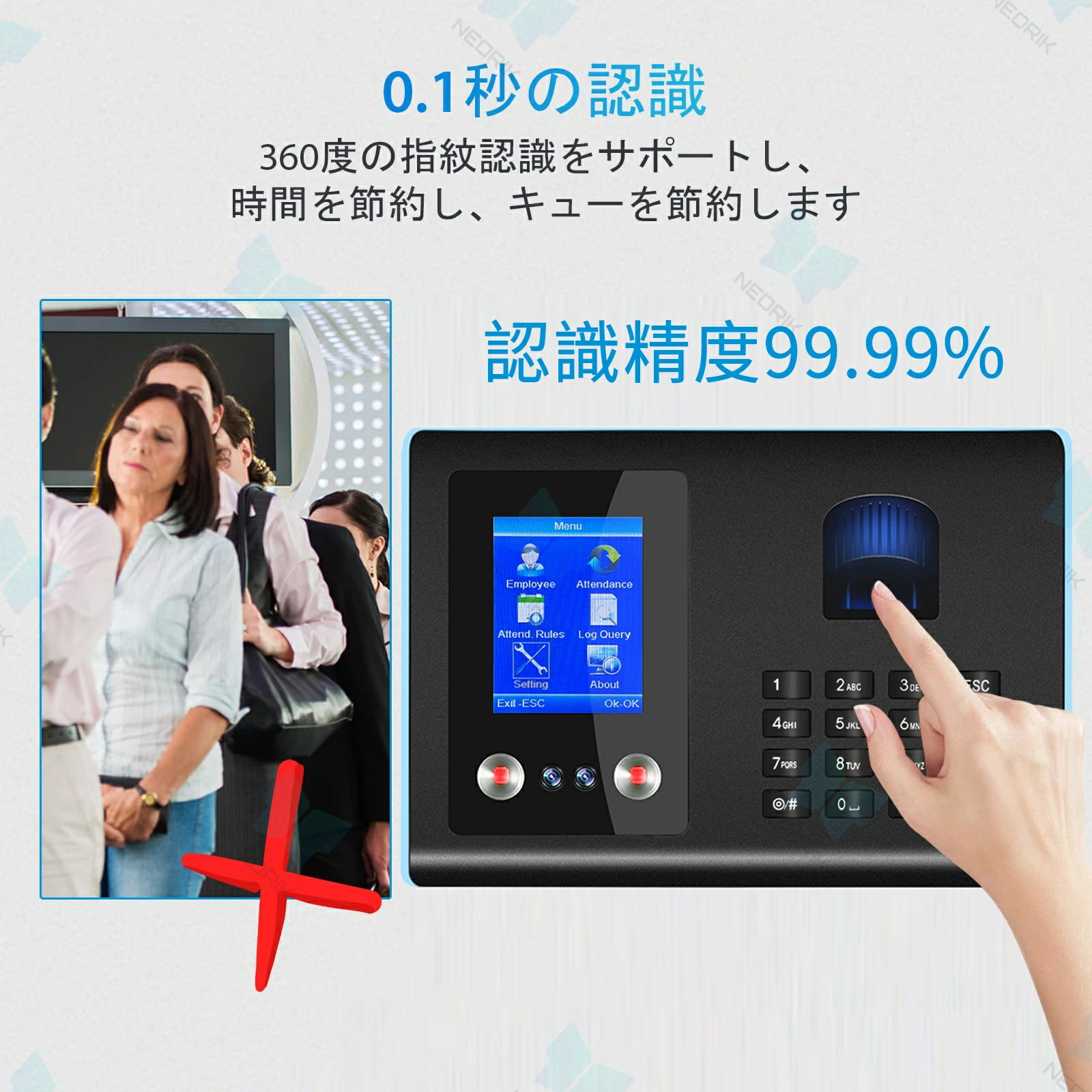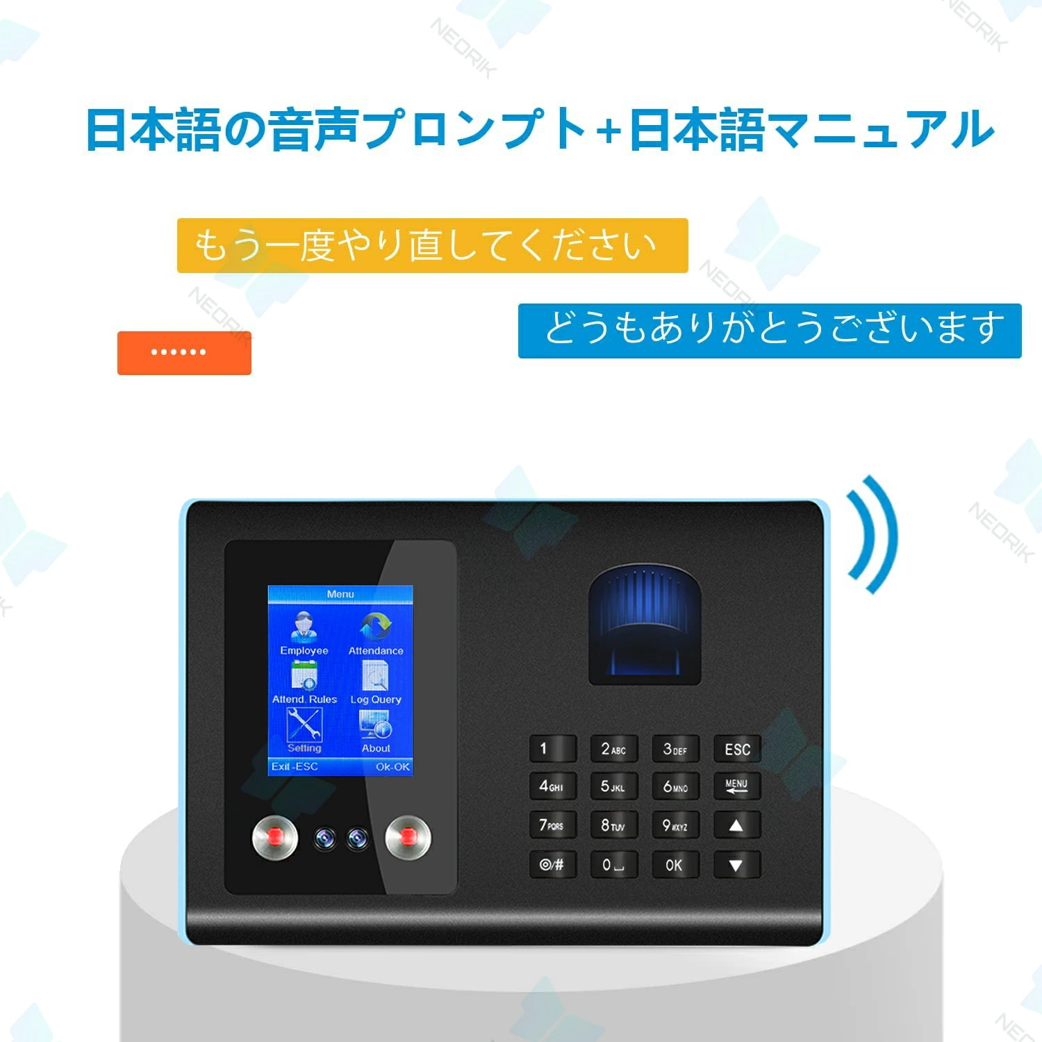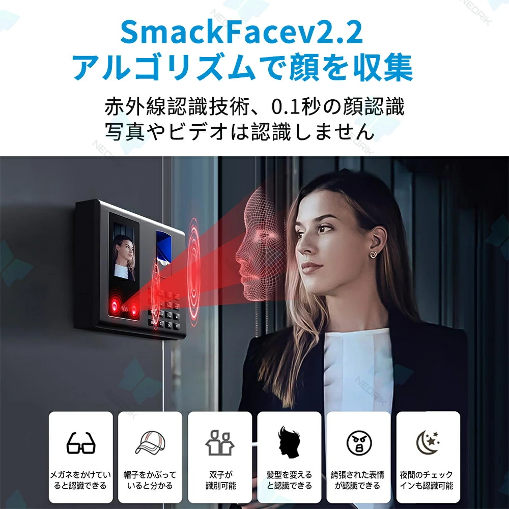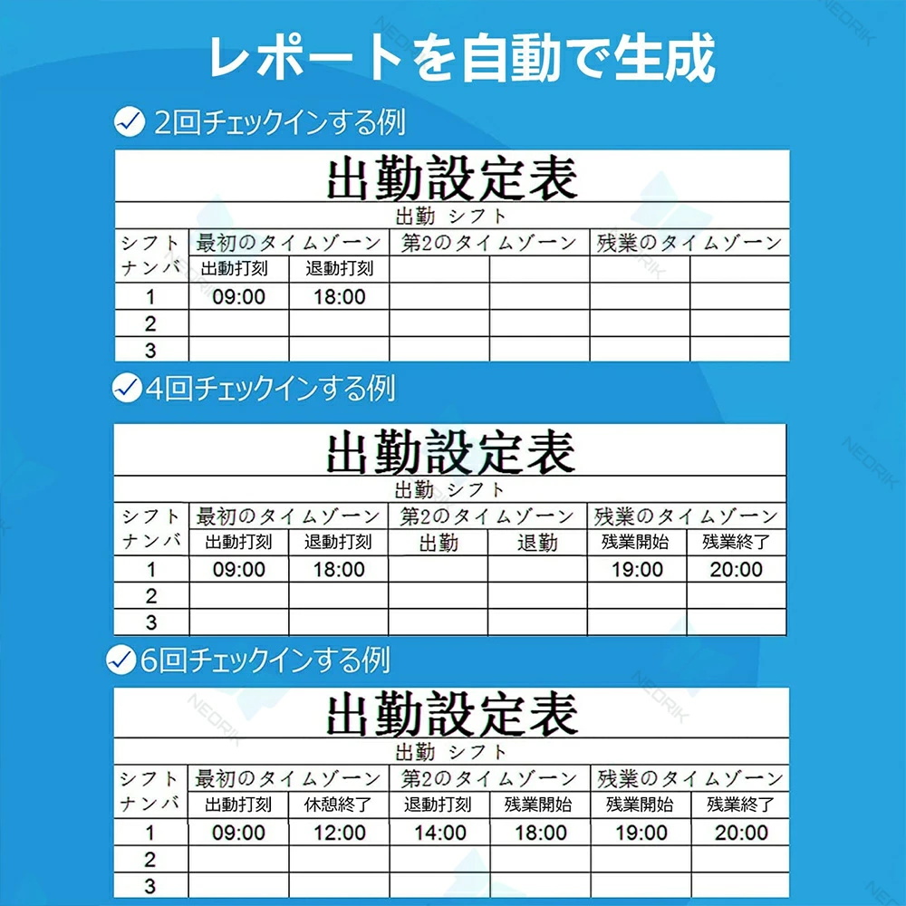 このタイムレコーダーは日本企業向けに特別に設計されており、日本語音声付きで使いやすいです。会社の勤怠プロセスを簡素化し、社員の通勤時間と勤怠データを自動的に記録し、手動の記録と検証の時間コストを削減し、作業効率を向上させます。勤怠データを通じて記録および分析することで、社員の働き方とリソースの利用状況をよりよく理解できるようになり、リソース配分の最適化とコスト削減につなげることができます。【便利な日本語フォームとデータ管理】