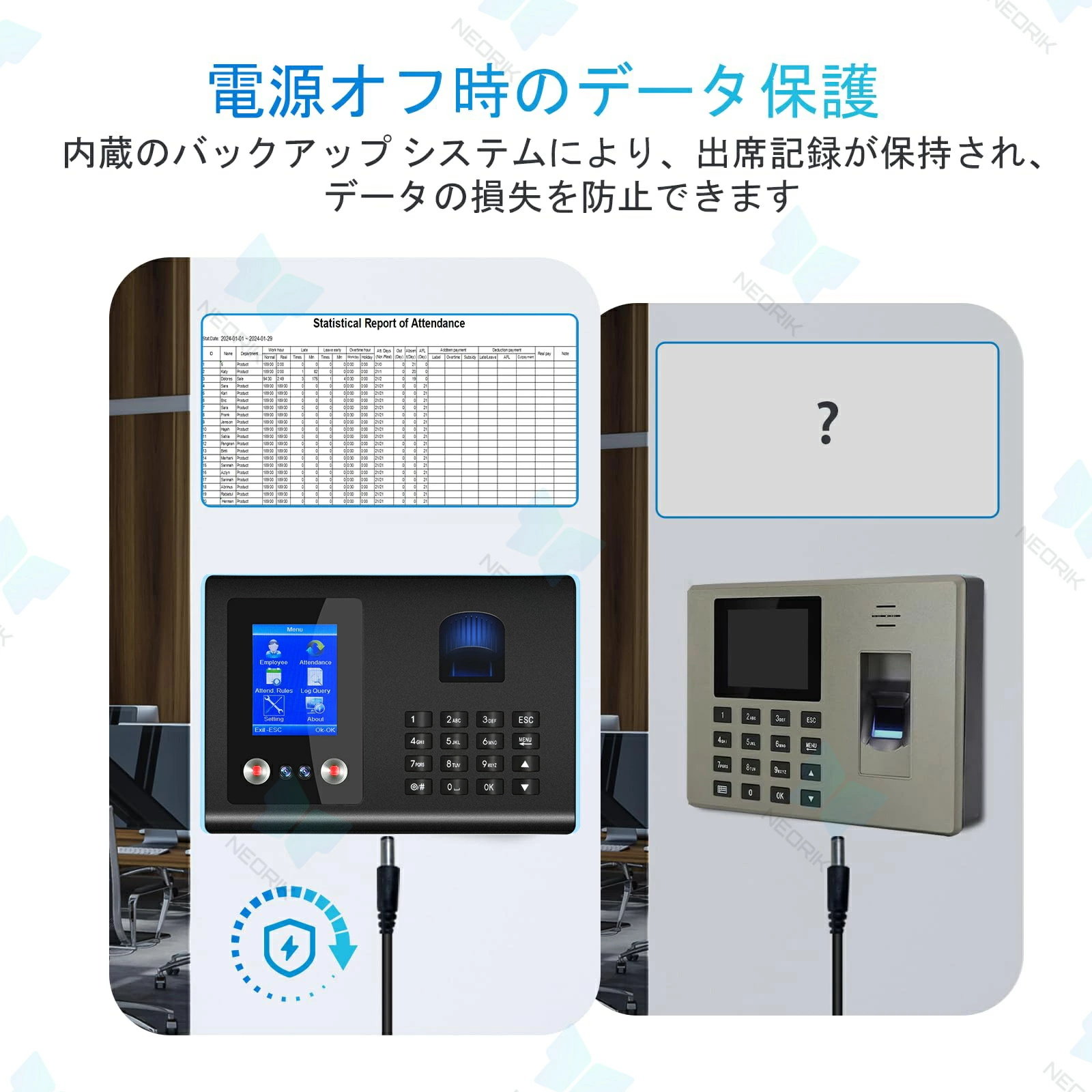 省スペースな壁掛けデザインで、事務所や店舗などに適した設置が可能。停電時でも記録が消える心配はなく、安心してご利用いただけます。