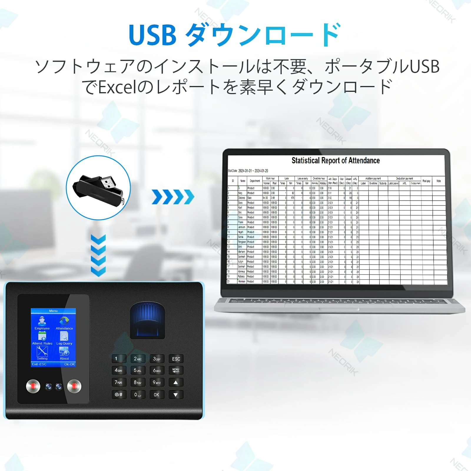 このパスワードタイムカードレコーダーは、USBドライバーレス直結に対応し、プラグアンドプレイで利用可能。FAT32形式のUSBメモリと互換性があり、最大100,000件の勤怠記録を迅速にエクスポート可能です。タイムカード機械の記録を簡単ダウンロード、素早くレポートを生成できるため、企業の勤怠管理効率を向上させます。