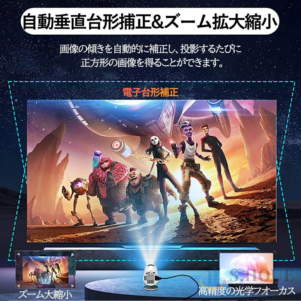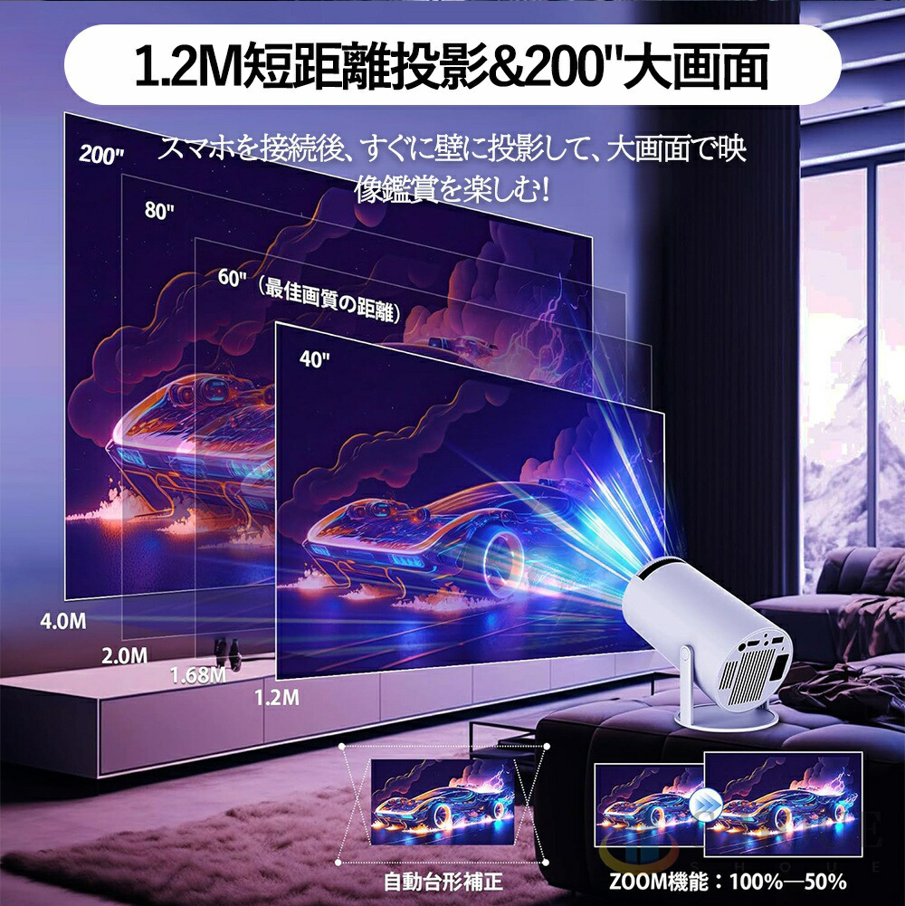 このスマートプロジェクターは自動台形補正技術,横置きでも斜め置きでも、垂直方向の自動台形補正機能により、傾いた画像を自動的に補正し;マニュアルフォーカステクノロジーを搭載し、わずか数秒で完璧な画像が得られます;このポータブルプロジェクターは短距離投影も備えており、投影距離は1〜4メートル、40〜130インチの大型スクリーンに対応している