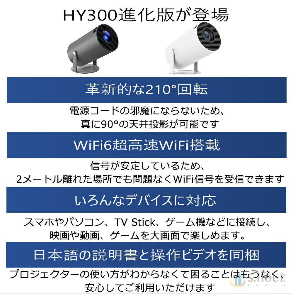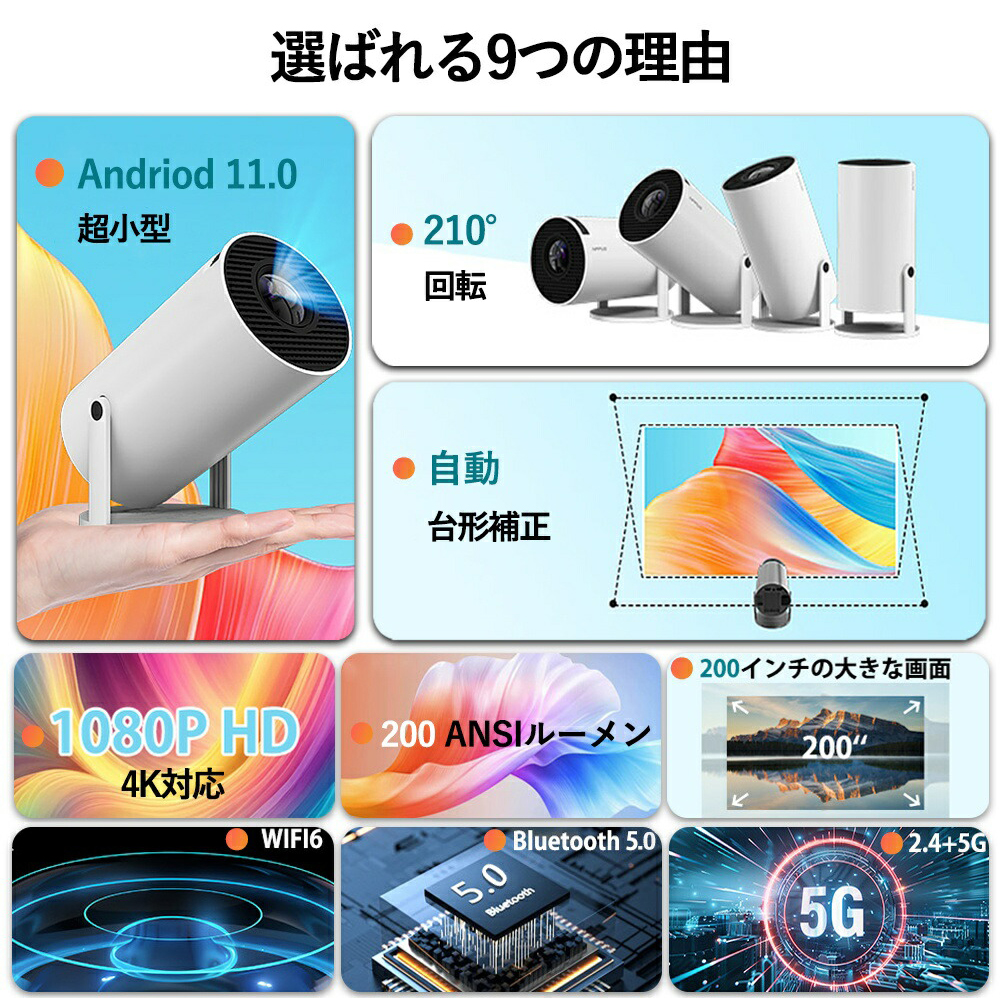 プロジェクター 小型 家庭用 壁.天井投影可能 210°回転 AndroidTV 2.4/5G Wi-Fi対応 Bluetooth 5.2 4Kビデオに適応する HDMIケーブル・リモコン付属 PSE認証済