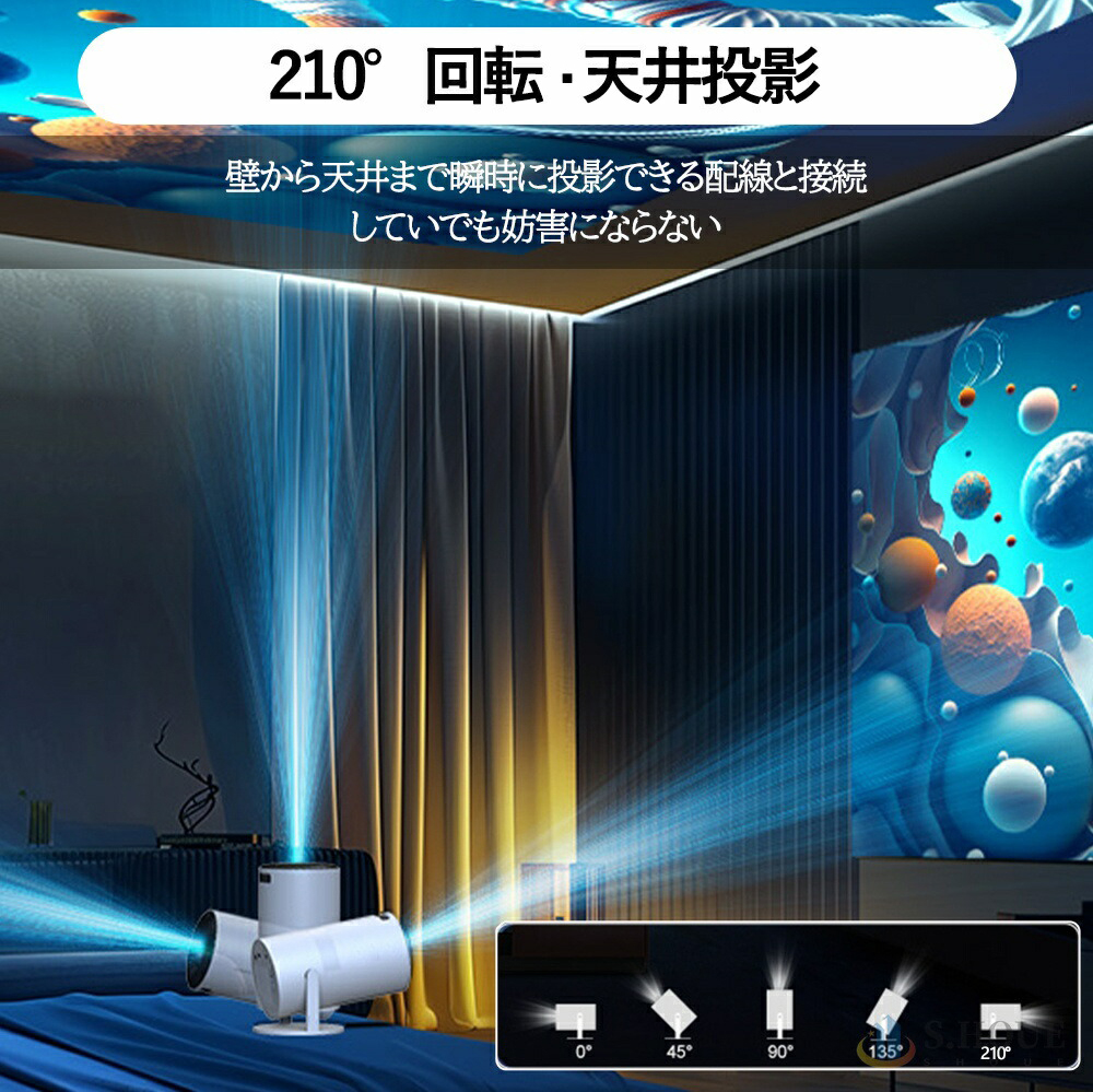 プロジェクター 小型 家庭用 壁.天井投影可能 210°回転 AndroidTV 2.4/5G Wi-Fi対応 Bluetooth 5.2 4Kビデオに適応する HDMIケーブル・リモコン付属 PSE認証済
