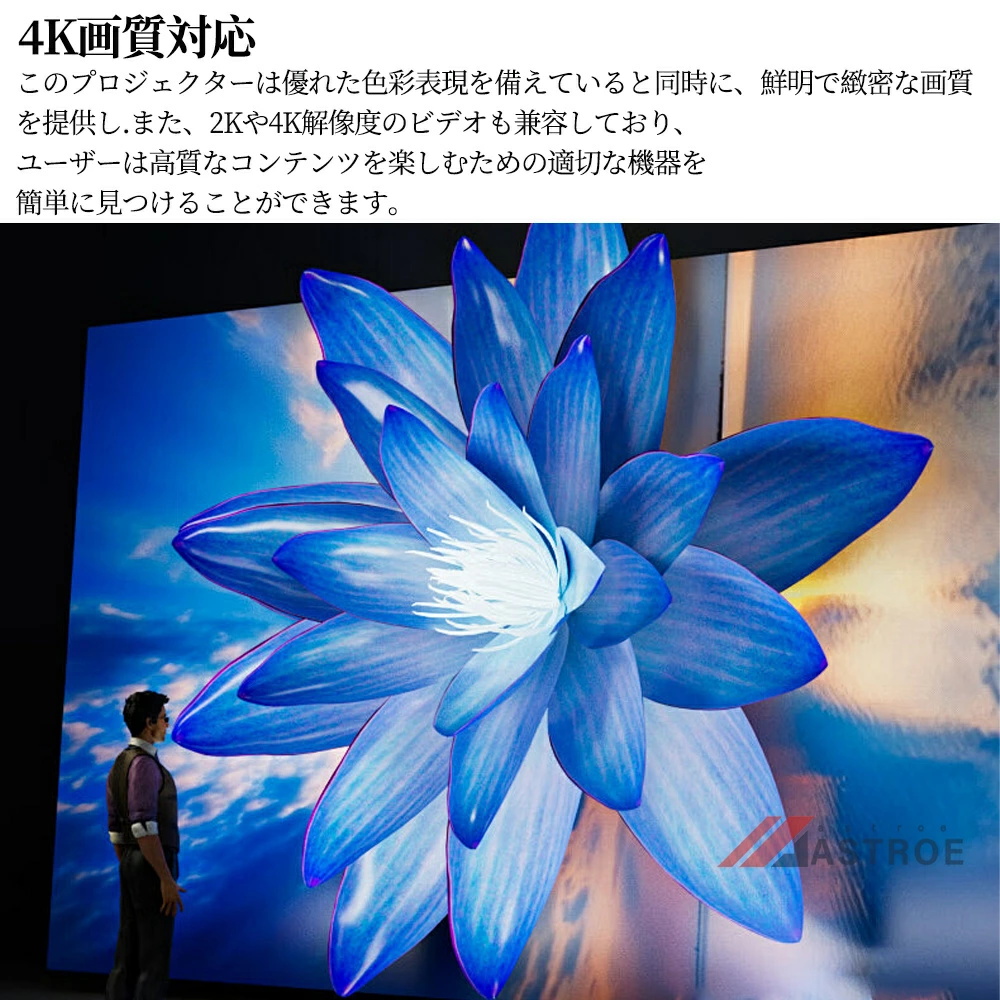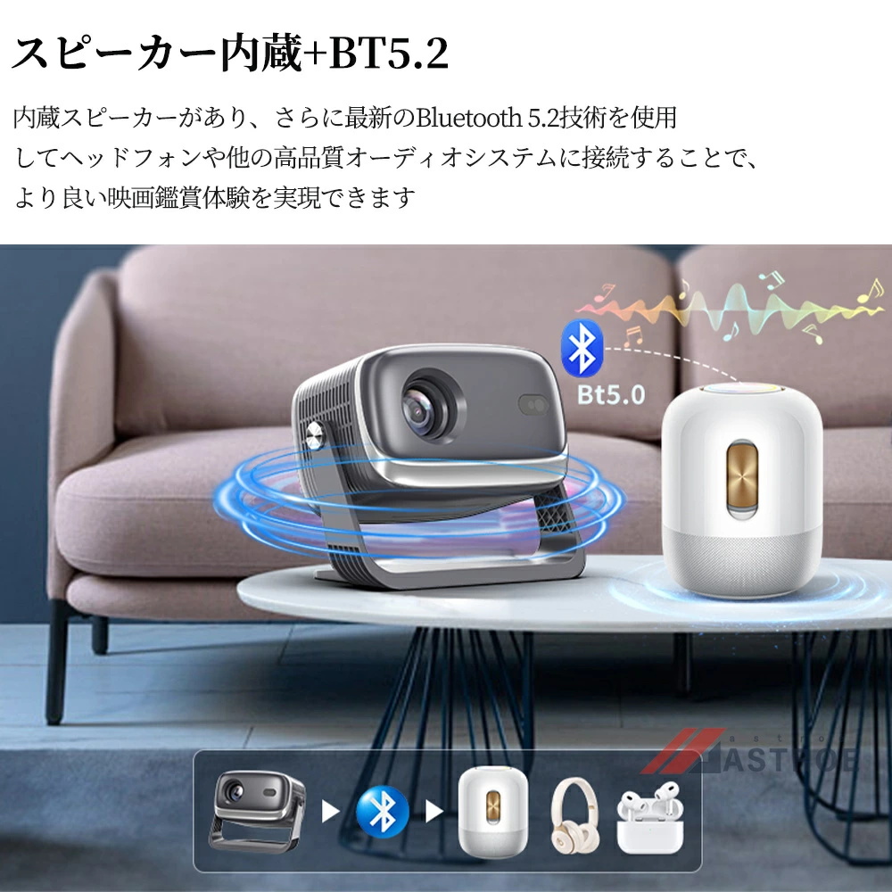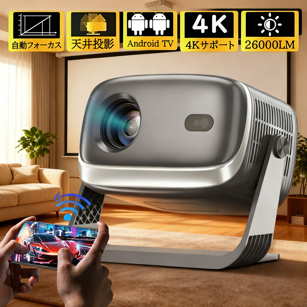 プロジェクター 家庭用 超小型 HiFi外部スピーカー 5G 軽量 Android TV12.0搭載 天井投影 4K対応 1080P 26000LM 自動台形補正 短距離 リモコン付き 簡単設定 壁
