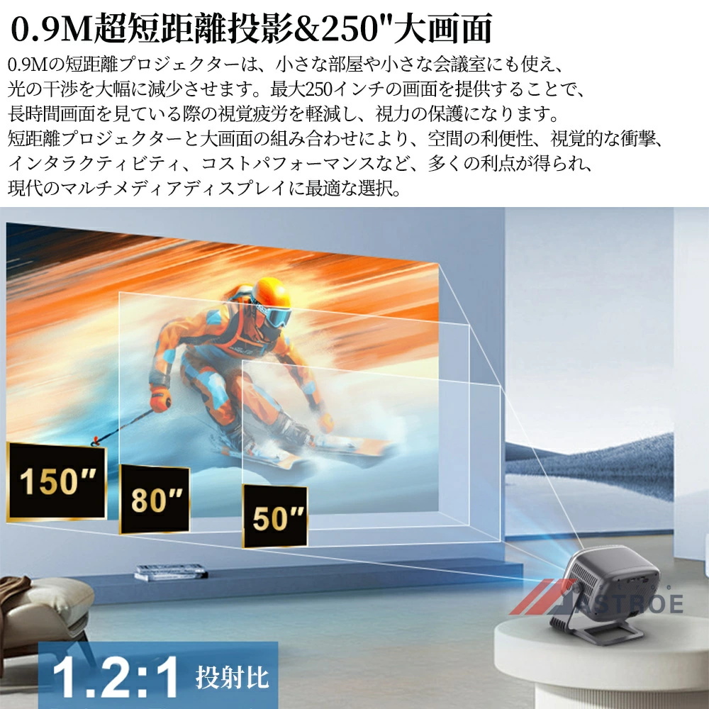独自のAI画像調整技術を採用、上下左右全方位台形補正、高速オートフォーカス、リモコンによるフォーカス微調整、障害物自動回避、ワンボタンでスクリーンへの自動アジャスト4つの機能を組み合わせ、便利な設置性に優れ、どこに置いても中断されなく、すぐに美しい映像が観れます。また、限られたスペースでも使用できるよう、1.2 : 1の投影比率で、1mの短距離でも大画面が楽しめ、日本のお客様には最適です!