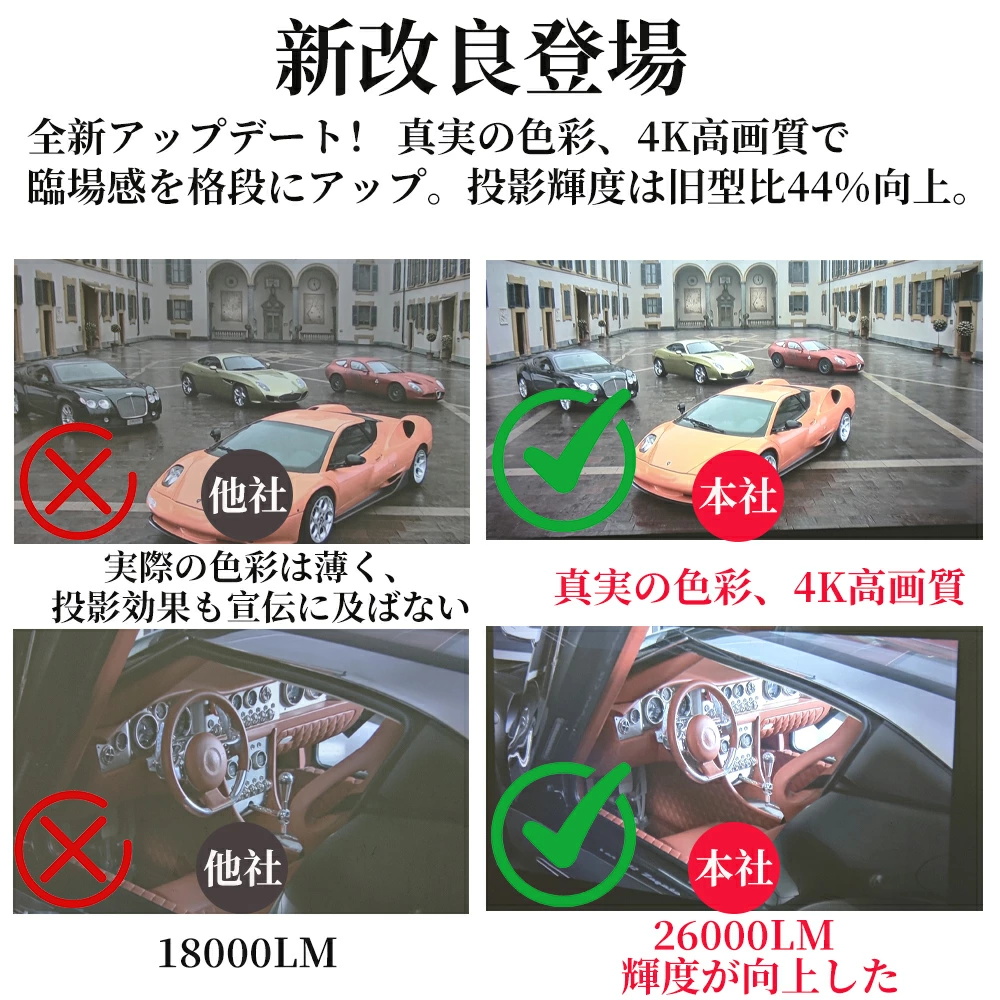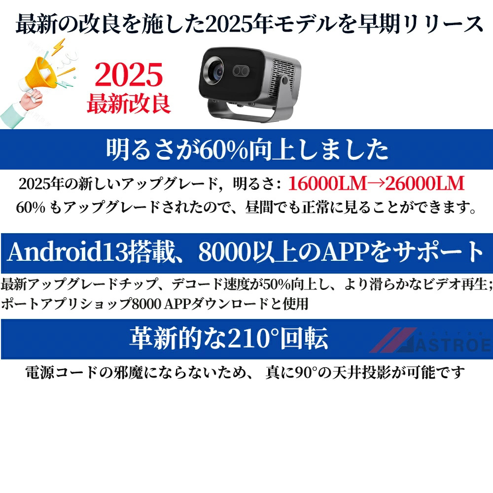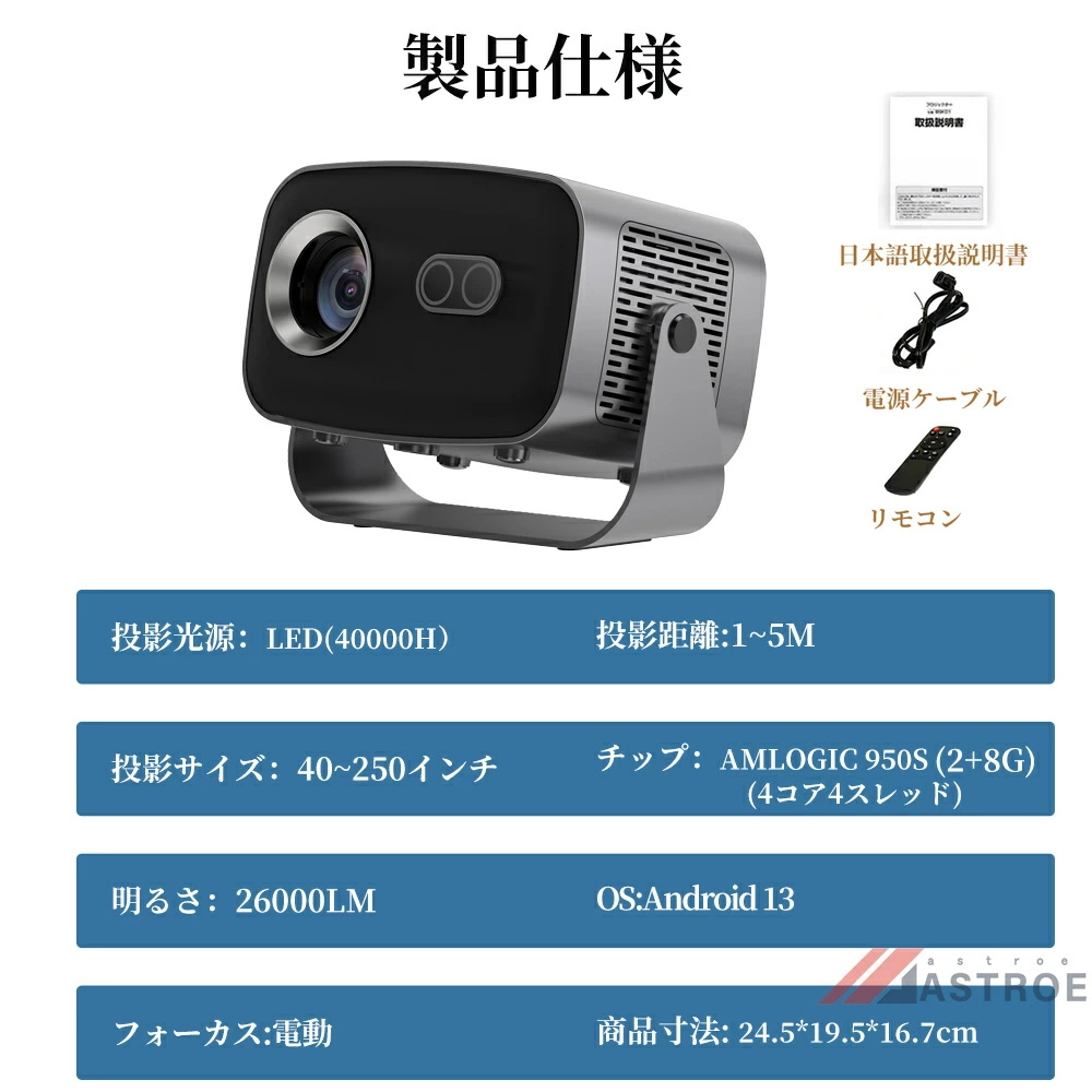 プロジェクター 小型 家庭用 天井投影 高画質 電動フォーカス android搭載 4K対応 映像機器 26000LM高輝度 ホームシアター Android13 静音 自動台形補正 明る 壁