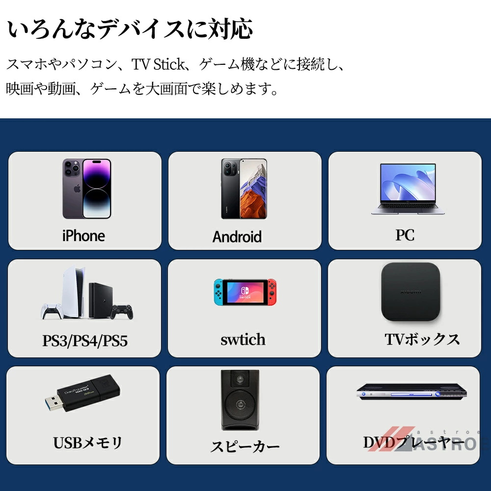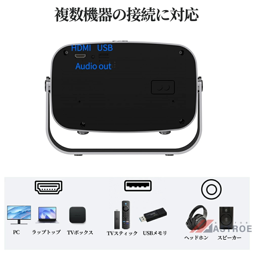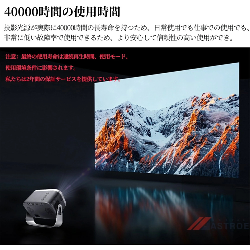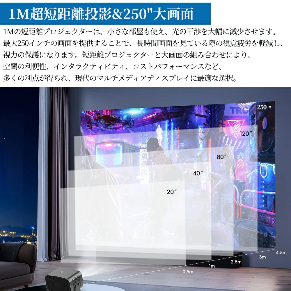 このスマートプロジェクターは自動台形補正技術,横置きでも斜め置きでも、垂直方向の自動台形補正機能により、傾いた画像を自動的に補正し;電動フォーカス技術搭載、わずか数秒で完璧な画像が得られます;このポータブルプロジェクターは短距離投影も備えており、投影距離は1〜5メートル、40〜250インチの大型スクリーンに対応している