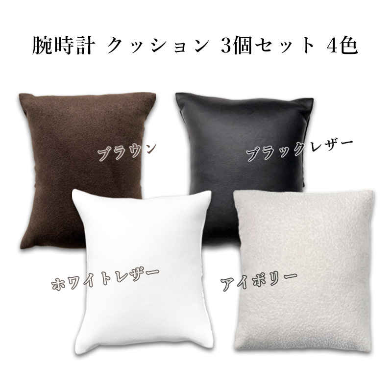 腕時計 クッション 3個セット 四角型 4色 ブラック ホワイト 合皮 アイボリー ブラウン ベルベット サイズ調整可能 交換用 ディスプレイ 収納