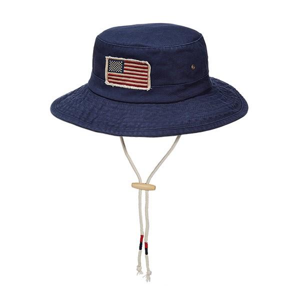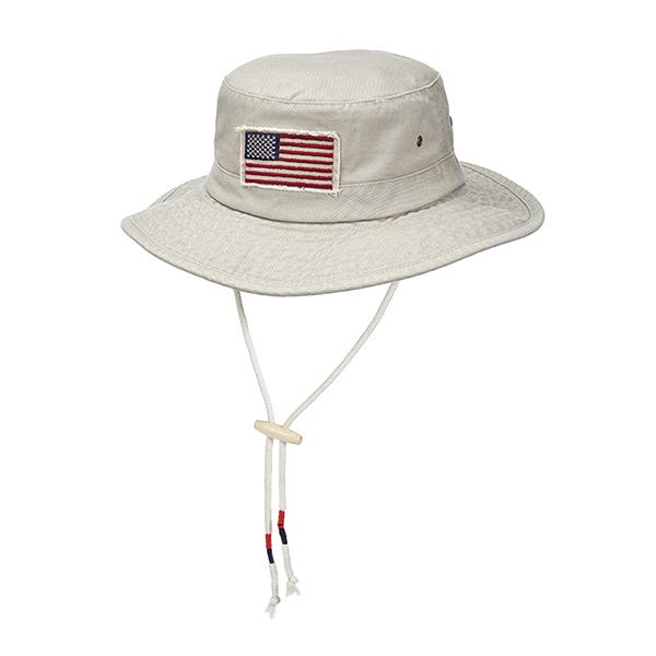 星条旗があしらわれたパッチが付いたコットンハットです。顎ひも付き。ウォッシュ加工が施された、ヴィンテージ感のある仕上がり。クラウンにはハトメが4箇所空いており、通気性も考慮されています。紫外線をカットするUPF50+で、機能性にも優れたアイテムです。