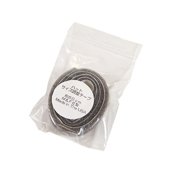 ハットの内側に貼り、サイズを調整するテープです。厚さ5mmのスポンジを一部に貼れば5mm、一周巻けば1cmのサイズダウンになります。お好みの長さにカットしてお使いください。