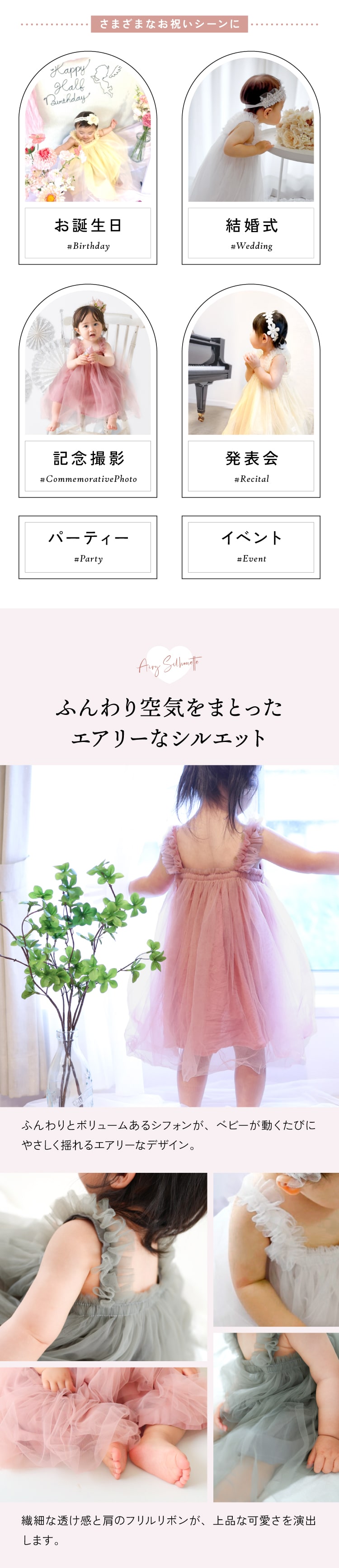 | 特長 | ふんわりシフォンでプリンセス気分 ベビーシフォンドレス ふんわり軽やかに広がる柔らかなフォルムが、無垢さな可愛さを際立たせる、小さなプリンセスのためのシフォンドレスです。 【おすすめポイント】 ◆ふんわり空気をまとったエアリーなシルエット ふんわりとボリュームあるシフォンが、ベビーが動くたびにやさしく揺れるエアリーなデザイン。 ◆様々なお祝いのシーンにぴったり お誕生日・結婚式・記念撮影・発表会・その他パーティーやイベントなどの装いに。 ◆着やすさにこだわったベビーにやさしい仕様 コットン100%の裏地付きでチクチクせず、頭からかぶるだけで着せやすくお着替えも楽ちんです。 ◆長く、たくさん着られる 重ね着すれば季節を問わず普段着使いOK! スカート使いもできるので成長に合わせて長く着ていただけます。 ◆選べる2サイズ サイズは、80と90をご用意。お子様の身長や体型に合わせてお選びいただけます。 ◆上品なニュアンスカラー カラーは派手すぎずやさしい色合いのニュアンスカラーを揃えました。 ベビーの柔らかな肌によくなじみ、上品な可愛さを演出します。 |