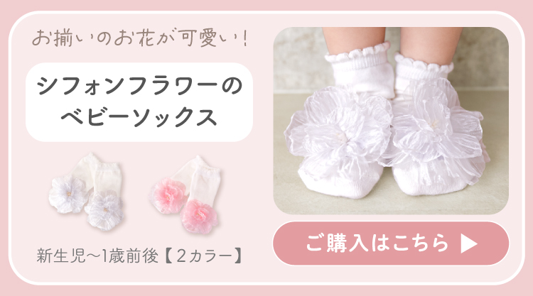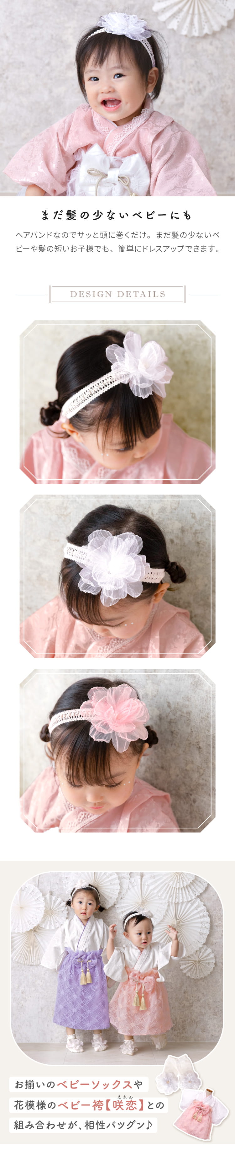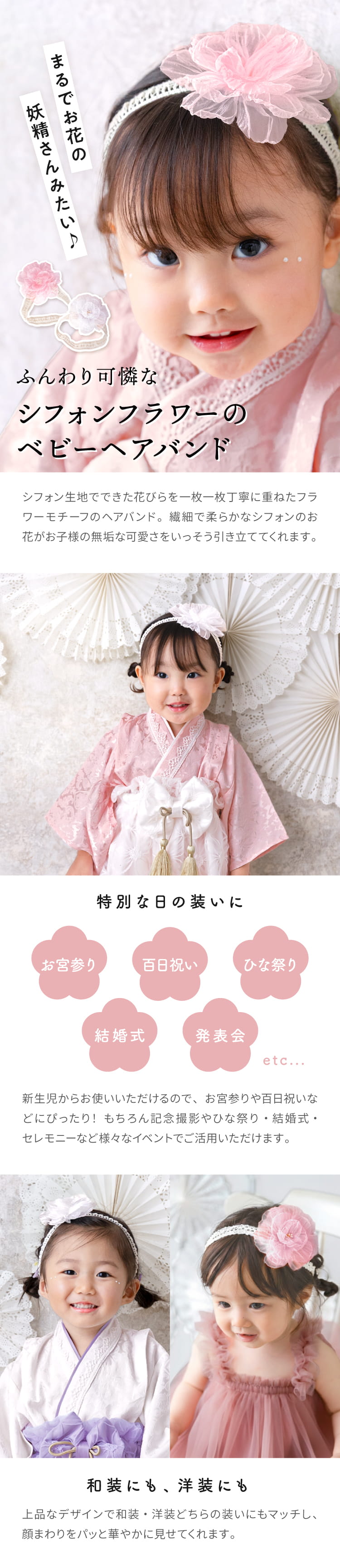 | 特長 | ふんわり可憐なシフォンフラワーのベビーヘアバンド シフォン生地でできた花びらを一枚一枚丁寧に重ねたフラワーモチーフのヘアバンド。 繊細で柔らかなシフォンのお花がお子様の無垢な可愛さをいっそう引き立ててくれます。 【おすすめポイント】 ◆特別な日の装いに 新生児からお使いいただけるので、お宮参り・百日祝いなどにぴったり! もちろん記念撮影やひな祭り・結婚式・発表会・セレモニーなど様々なイベントでご活用いただけます。 ◆和装にも、洋装にも 上品なデザインで和装・洋装どちらの装いにもマッチし、顔まわりをパッと華やかに見せてくれます。 ◆まだ髪の少ないベビーにも ヘアバンドなのでサッと頭に巻くだけ。 まだ髪の少ないベビーや髪の短いお子様でも、簡単にドレスアップできます。 |