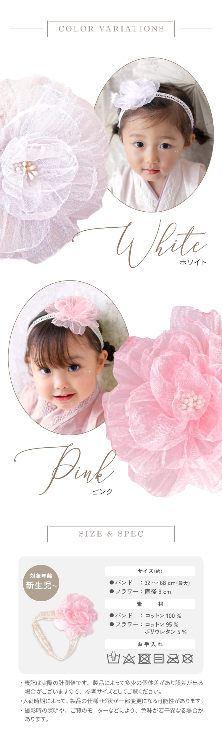 | サイズ(約) | ・バンド:32〜68cm(最大) ・フラワー:直径9cm |