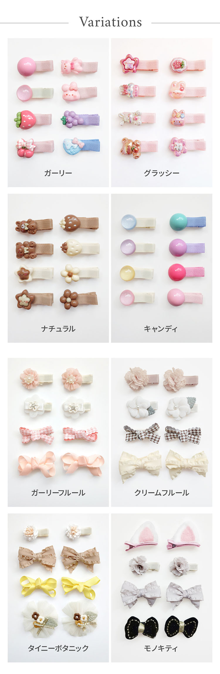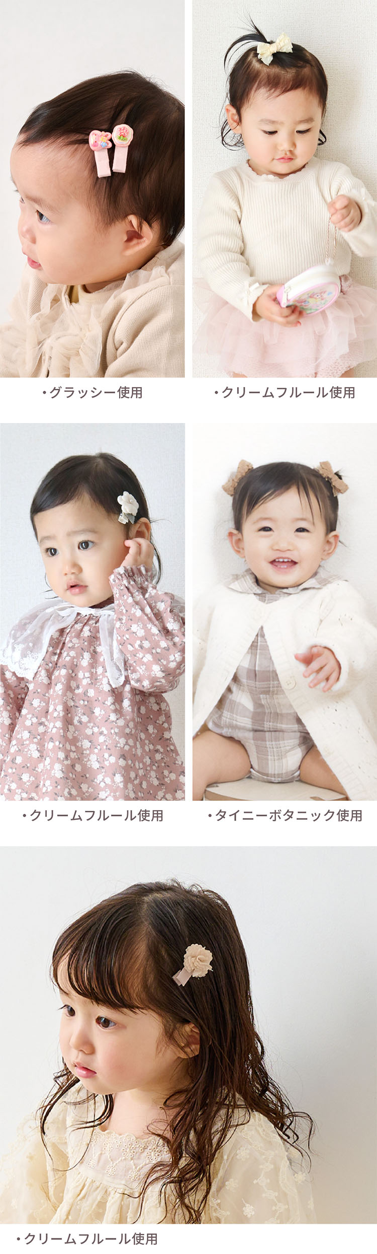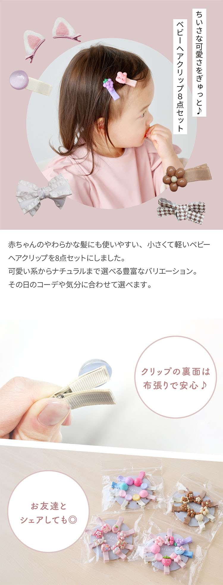 | 特長 | ちいさな可愛さをぎゅっと!ベビーヘアクリップ8点セット 赤ちゃんのやわらかな髪にも使いやすい、小さくて軽いベビーヘアクリップを8点セットにしました。 可愛い系からナチュラルまで選べる豊富なバリエーション。 その日のコーデや気分に合わせて選べます。 |