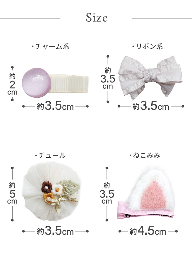 | サイズ(約) | 共通サイズ/チャーム系:縦2×横3.5cm、リボン系:縦3.5×横3.5cm、チュール:縦5×横3.5cm、ねこみみ:縦3.5×横4.5cm |
