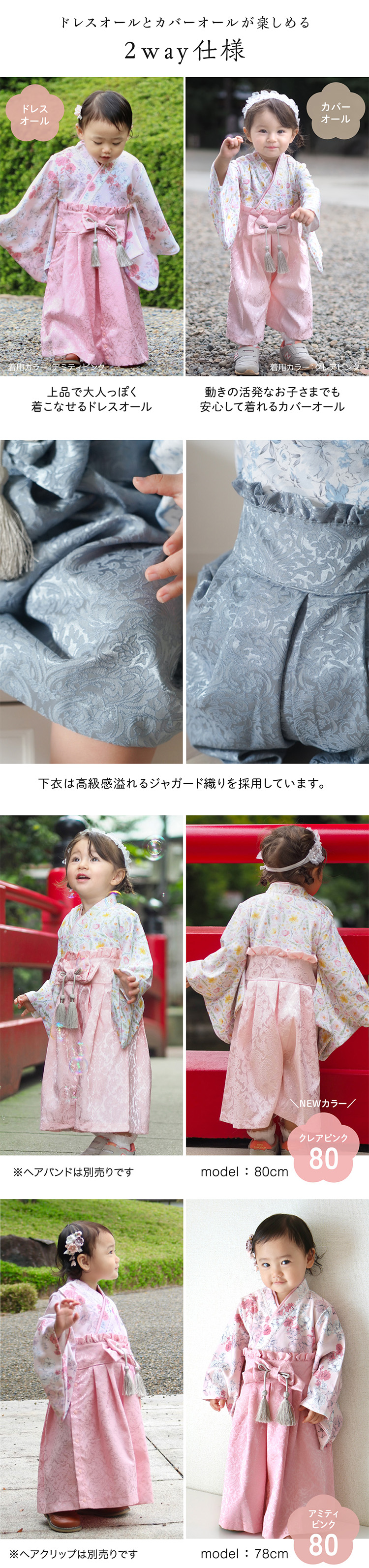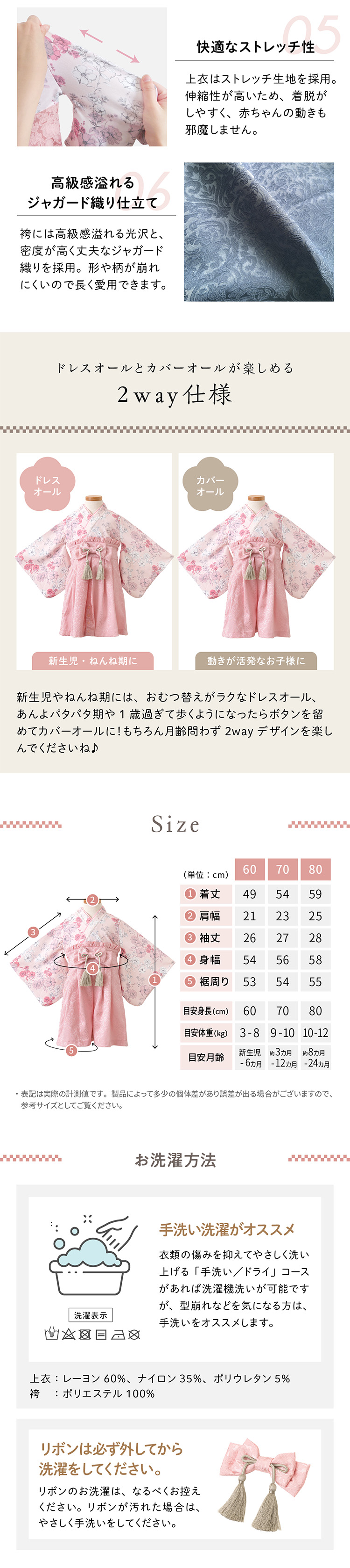 | 特徴 | 赤ちゃんへの愛情をギュッと詰め込んだregalo piuオリジナルベビー袴ロンパース花恋(かれん)が登場。上品な花柄デザインとストレッチの効いた上衣、そして高級感溢れるジャガード織りの袴部分。ロンパースなので、お着替えやおむつ替えも楽々! |