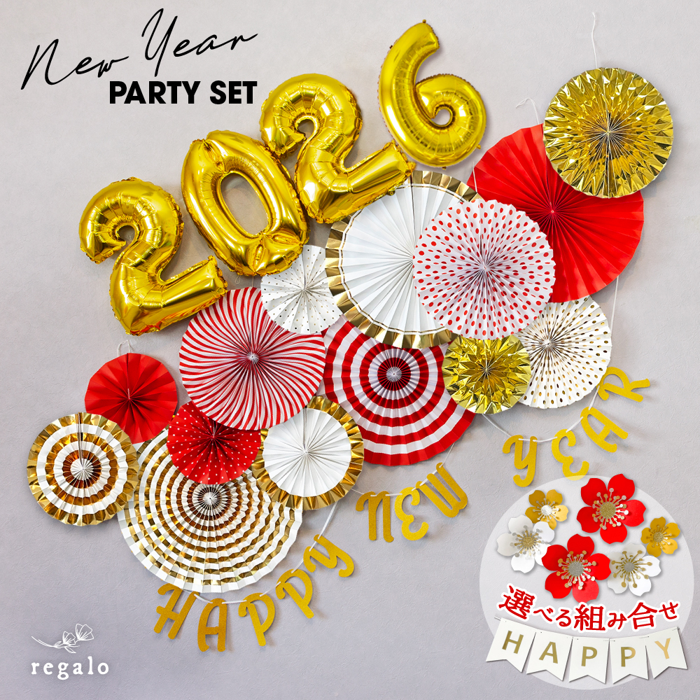 | 商品説明 | ★新年を盛り上げる New Year パーティーセット★ お正月パーティやイベントのデコレーションとしてはもちろん、ニューイヤーフォトや年賀状にも♪ 2026の数字バルーン、ゴールドペーパーファン8枚組をベースにNewYearレターバナーやペーパーデコレーションの組み合わせが選べるボリューム満点で華やかなセットです! |