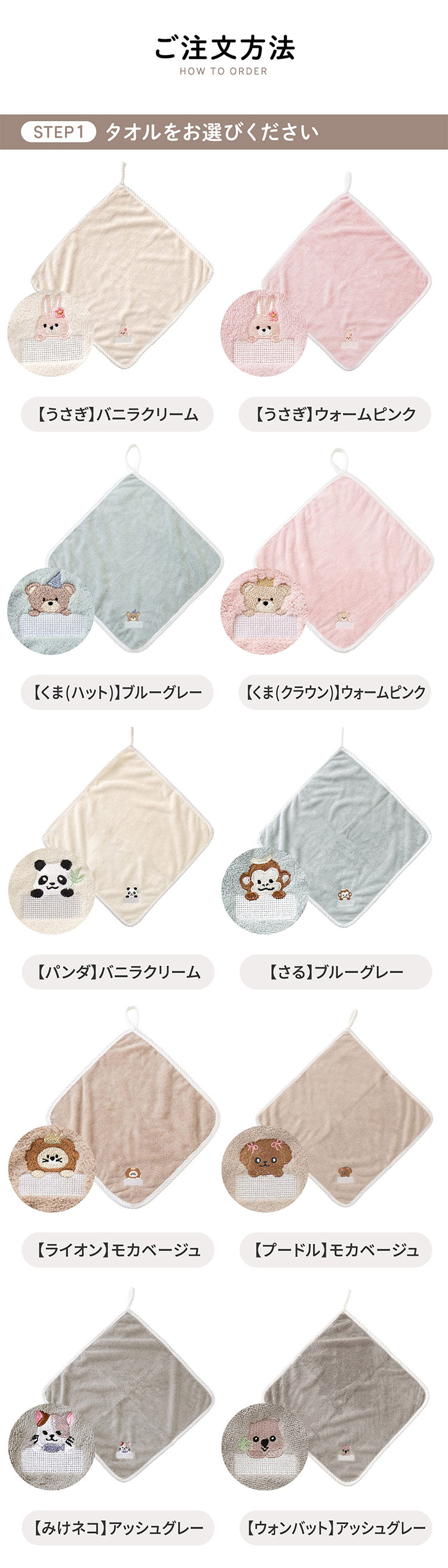 | バリエーション | 【デザインが選べる】ループタオル ・【うさぎ】バニラクリーム ・【うさぎ】ウォームピンク ・【くま(ハット)】ブルーグレー ・【くま(クラウン)】ウォームピンク ・【パンダ】バニラクリーム ・【さる】ブルーグレー ・【ライオン】モカベージュ ・【プードル】モカベージュ ・【みけネコ】アッシュグレー ・【ウォンバット】アッシュグレー |