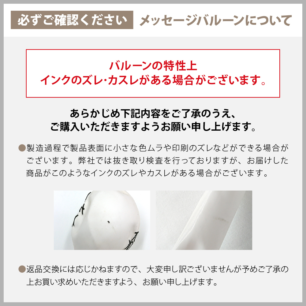 | 注意事項 | あらかじめ下記内容をご了承のうえ、ご購入いただきますようお願い申し上げます。 ※「ご注文前の確認事項」をよくお読みいただき、返品交換についてご了承のうえご購入いただきますようお願いいたします。 ※入荷時期によって、製品の仕様・形状が一部変更になる可能性があります。 ※撮影時の照明や、ご覧のモニターなどにより、色味が若干異なる場合があります。 ※表記は実際の計測値です。製品によって多少の個体差があり誤差が出る場合がございますので、参考サイズとしてご覧ください。 ※バルーンはただんだ状態でお届けいたします。 ※ゴム風船にパウダーが付いている場合がございます。こちらは、製造する時に他バルーンとの付着・破損を防ぐために使われる粉となります。原材料は、人体には影響はないベビーパウダーと同じものとなります。 ※検品の際に目視で確認できない細かい穴が空いている場合がございます。そのため、予備の風船を数枚含めてお届けいたします。 ※膨らませすぎにはご注意ください。破損のおそれがあります。 ※メッセージバルーンは特性上、インクのズレ・カスレがある場合がございます。 |