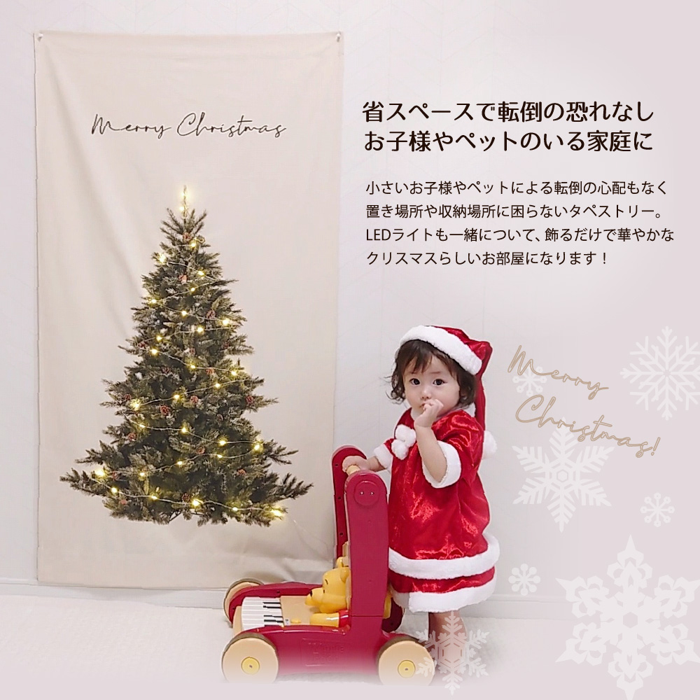 | 特長 | すぐに飾れる!場所をとらない!簡単にクリスマスの雰囲気を演出! 手軽にクリスマスツリーを楽しみたい方や小さなお子さまのいるご家庭に人気のクリスマスタペストリー。 色とデザインが違う2種類のLEDライト付きタペストリーをご用意しました。 ・飾るのも、収納するのも最小スペースで◎ 一枚の布だから気軽にリビングや寝室、廊下や玄関の壁など好きなところに飾ることができます。 片付ける際も壁から外して折りたたむだけなので、出し入れするのも簡単。 収納スペースが少ない住宅やあまり荷物を増やしたくないなど、収納で悩む方にもおすすめです。 ・倒れる心配がないので子どもにもペットにも安心! 手や足でコード触ったり引っ張ったりして倒れる危険性もない布タペストリー。 倒れて怪我をする心配がないので、赤ちゃんや小さなお子さまがいるご家庭でも安心して飾っていただけます。 ・アートパネル感覚で誰でも気軽に楽しめる 天然のモミの木が大きく描かれたおしゃれなクリスマスタペストリー。 描かれたクリスマスツリーの上に飾りつけをすると、より華やかで素敵なタペストリーになります。 安全ピンやマスキングテープを使ってオーナメントやLEDライトを取り付ければ、描かれたツリーがもっと華やかに。自分だけのクリスマスツリーを彩りましょう! ・ライトアップで夜も違う楽しみ方を LEDライトを付けると、本物のクリスマスツリー並みの存在感が生まれます。 ライトアップすると布の内側から柔らかくこぼれるLEDライトの光が、タペストリーに独創的な印象を与えます。 ※タペストリーの下にも空洞があり、錘用に棒を通したり、LEDライトの電池部分を入れる事も出来るよう幅が広めになってます。 |