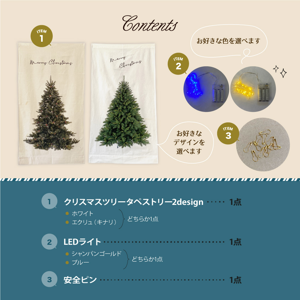 | カラーバリエーション | ◆ツリータペストリー ・ホワイト ・エクリュ(キナリ) ※カラーにより、ツリーの柄も違います ◆【LEDライト】 ・シャンパンゴールド ・ブルー |