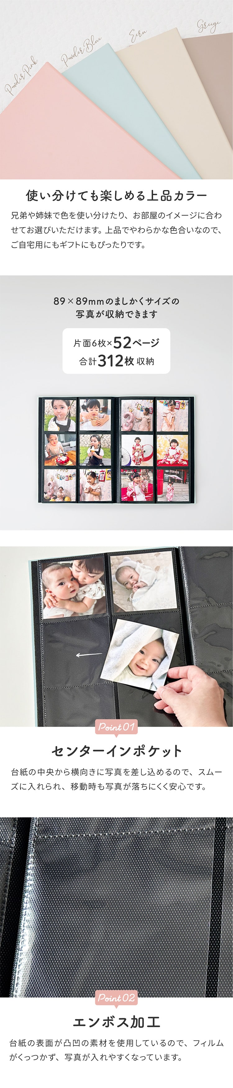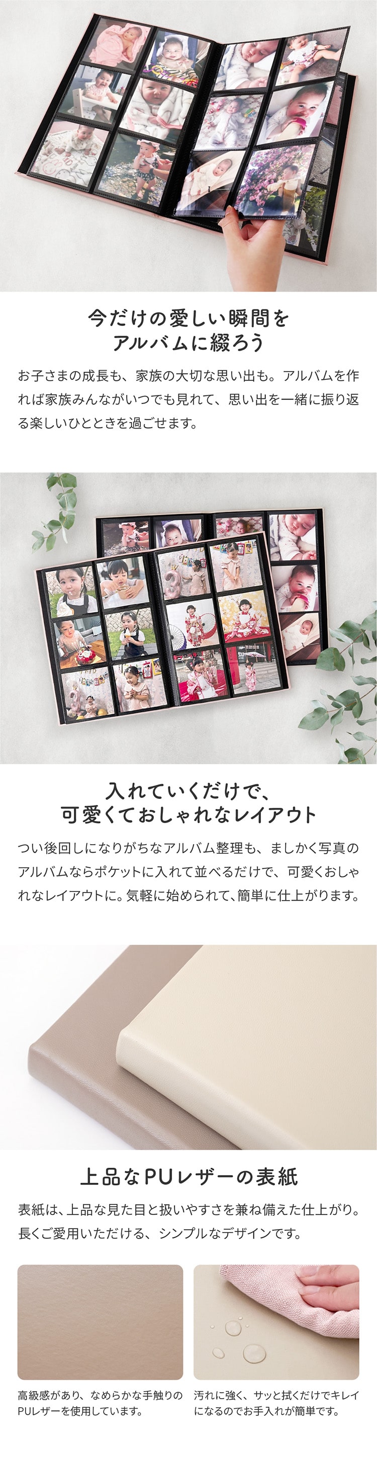 | 特長 | 今だけの愛しい瞬間をアルバムに綴ろう おしゃれにレイアウトできるスクエアアルバム つい後回しになりがちなアルバム整理も、ましかく写真のアルバムならとっても簡単!ポケットに入れて並べていくだけで、可愛くおしゃれなレイアウトになります。 【おすすめポイント】 ●上品なPUレザーの表紙 表紙は、上品な見た目と扱いやすさを兼ね備えた仕上がり。長くご愛用いただける、シンプルなデザインです。 ●使い分けても楽しめる上品カラー 兄弟や姉妹で色を使い分けたり、お部屋のイメージに合わせてお選びいただけます。上品でやわらかな色合いなので、ご自宅用にもギフトにもぴったりです。 ●センターインポケット 台紙の中央から横向きに写真を差し込めるので、スムーズに入れられ、移動時も写真が落ちにくく安心です。 ●エンボス加工 台紙の表面が凸凹の素材を使用しているので、フィルムがくっつかず、写真が入れやすくなっています。 ●スリムで省スペース 厚み約26mmのスリムサイズ。大きさもA4クリアファイルとほぼ同じだから、本と並べてもスッキリ収納できます。 |