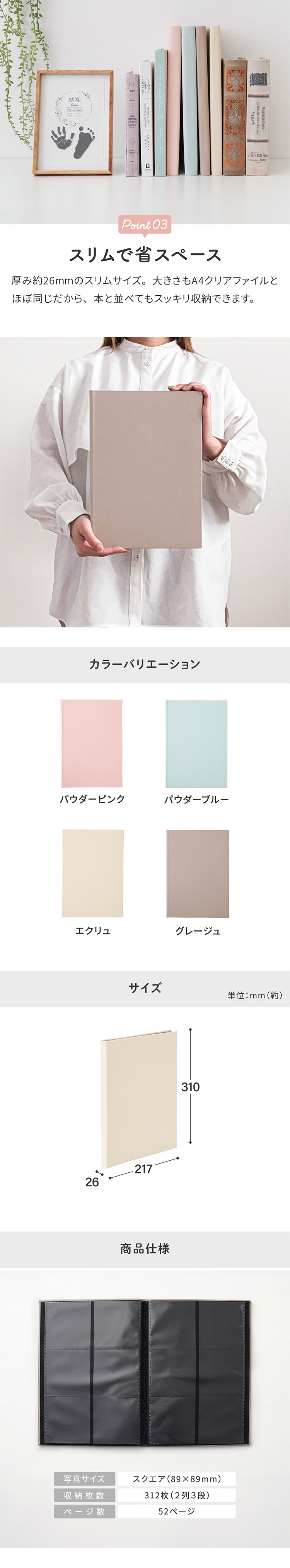 | 仕様 | ・収納枚数:312枚(2列3段) ・写真サイズ:スクエア(89×89mm) ・ページ数:52ページ ・表紙:PUレザー |