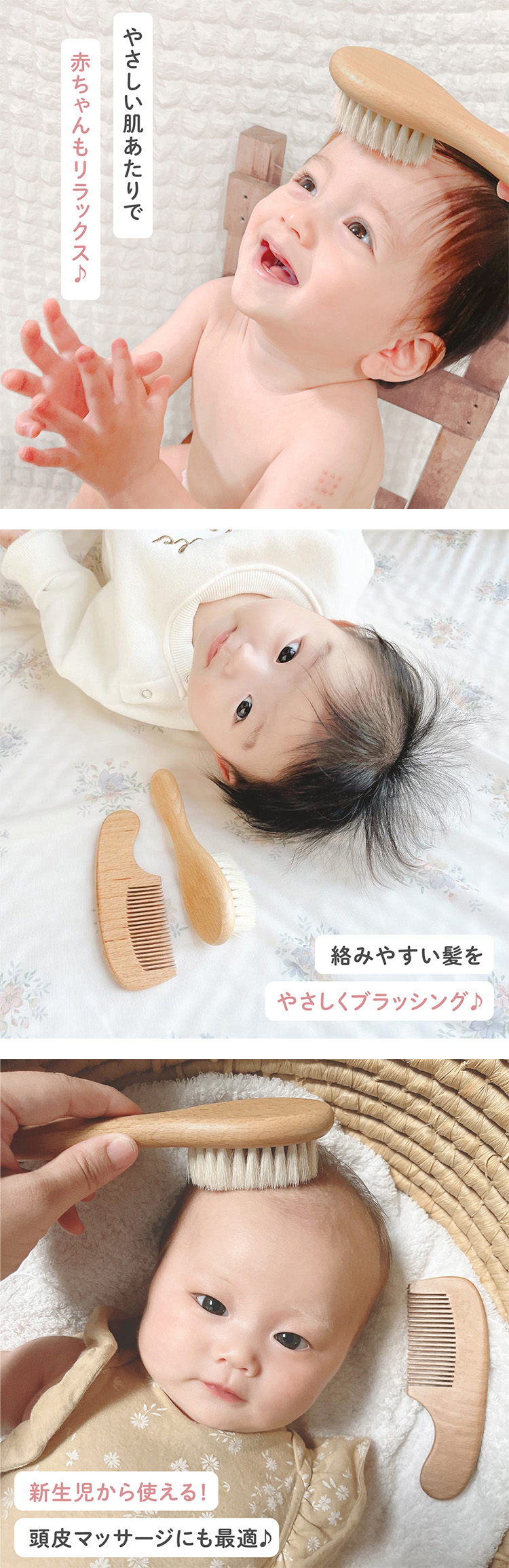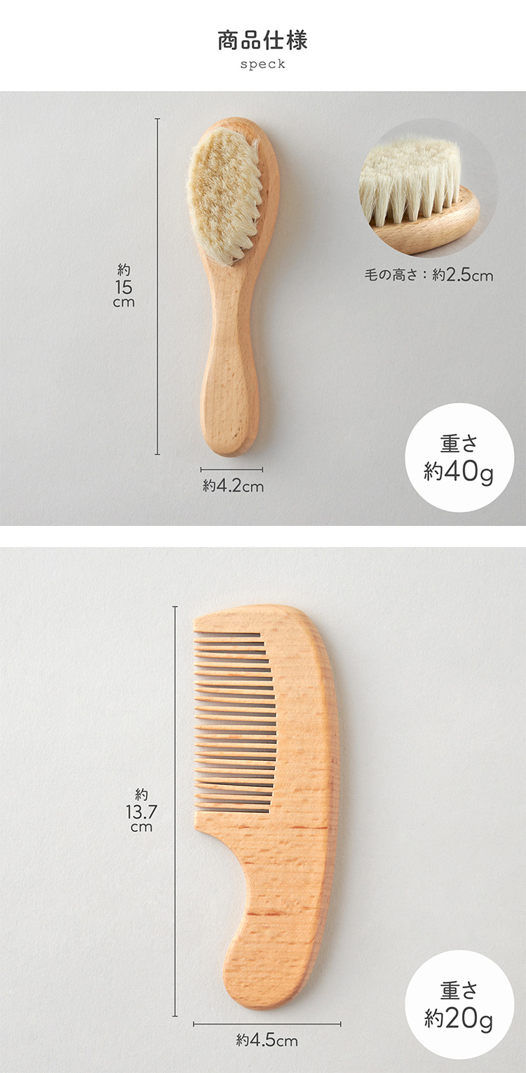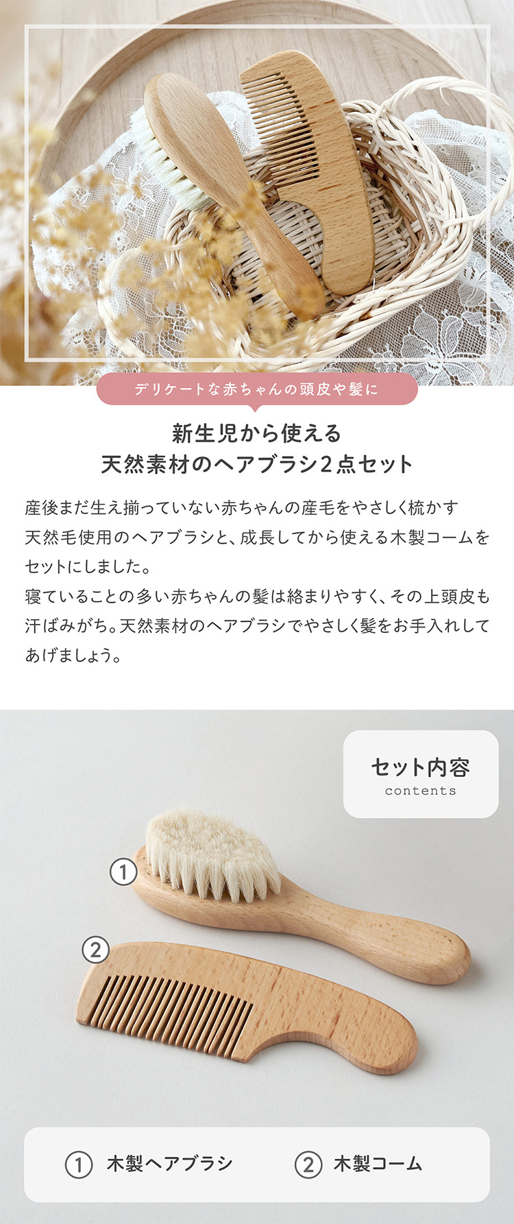 | 特長 | 新生児から使える天然素材のヘアブラシ2点セット |