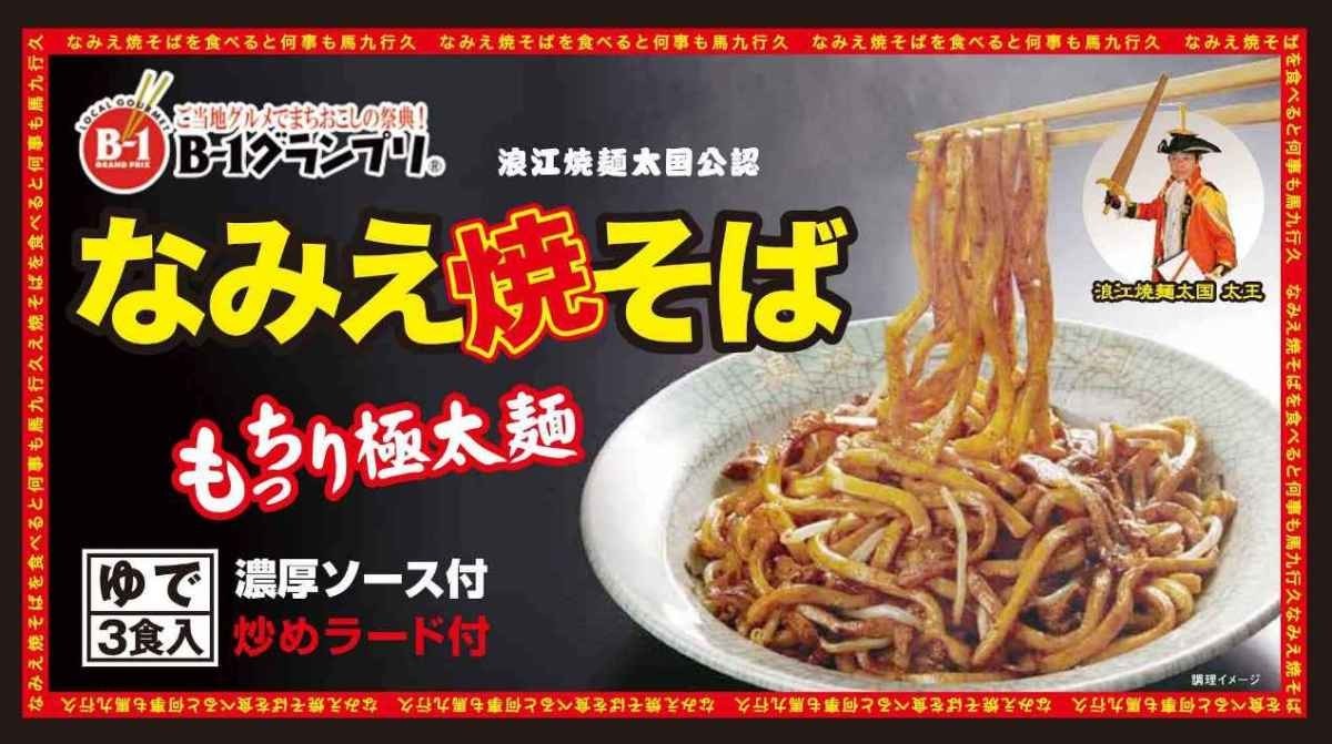 第8回B-1グランプリ・ゴールドメダル(優勝)を受賞した福島県のご当地グルメ。 福島県双葉郡浪江町の安くておいしい、昔から親しまれる極太麺の『なみえ焼そば』。約50年前、労働者のために食べ応えと腹持ちをよくするために考案されたとされています。通常の約3倍のもある太い麺と、うまみたっぷり濃厚ソース、豚肉とモヤシだけのシンプルな具が特徴です。一味唐辛子を振りかけて食べるのが通な食べ方とされる。 なみえ焼そばの定義 その1 中華麺の太麺を使う その2 具材はモヤシと豚肉を基本とする その3 ソース味であること 『浪江焼麺太国』公認商品 なみえ焼そば3食 | 麺170g×3・ソース 36g×3・ラード 4g×3、一味唐辛子×3 | ・めん:小麦粉、植物油、食塩、加工でん粉、かんすい、クチナシ色素、酸味料、グリシン | ・ソース:ウスターソース、砂糖、粉末ソース、食塩、ぶどう糖果糖液糖、トマト、オニオン、香辛料、調味料(アミノ酸等)、カラメル色素、酸味料 ・純製ラード:豚脂、酸化防止剤(ビタミンE)、シリコーン ・一味唐辛子:とうがらし (原材料の一部に小麦、大豆、豚肉を含む) 常温 90日 | 直射日光、高温多湿の場所を避け常温で保存して下さい。 | 開封後は、冷蔵庫で保存し早目にお召し上がり下さい。 | ||||||