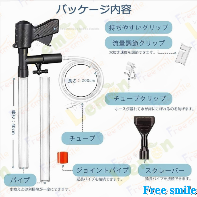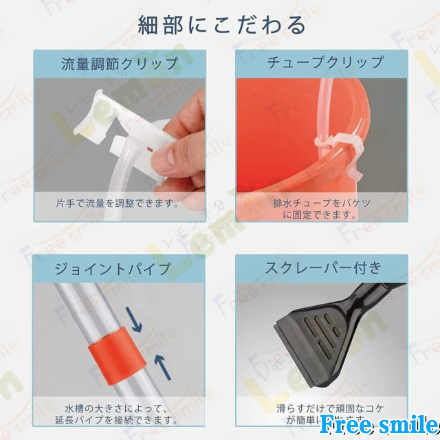 水槽底砂用クリーナーは砂利はそのまま、水とごみを手動で素早く簡単に排出します。これで水槽の掃除も快適になります。水を替えないまま藻類を清掃、汚れを取り、砂利をクリーニングできます。