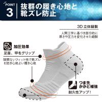 歩行やランニングの衝撃から足を保護するために、つま先やかかとに衝撃吸収技術を採用しています。また、適度な加圧でしっかりフィットするため生地と皮膚との摩擦による靴ズレを防ぎます。