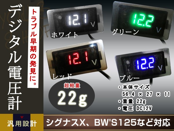 | 【商品情報】 ■サイズ゛ 56.4mm × 27mm × 11mm ■電圧 DC12V ■表示電圧 8.0V〜18.0V ■表示単位 0.1V刻み ■カラー レッド ブルー グリーン ホワイト ■参考取り付け車種 シグナスX BW'S125 BWS125 など ■セット内容 商品画像に記載 |