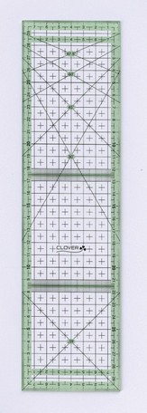 また、定規の周囲の目盛の背景「カラーライン」は、縫いしろ幅にあわせた7.5 mmなので、縫いしろをとる作業も楽にできます。押さえやすい8cmの広幅でピースカットに必要な角度線も充実しています。