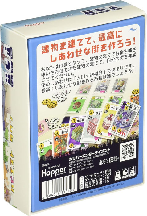 プレイヤーは市長となって、その街に住む人々の幸せため街づくりを行います。施設を建設し、建設した施設から得た資金を使って新たな施設を建設する…。コンビニからはじまり、学校、動物園、空港など、建設できる施設は実に40種類以上!より多くの資金を集めて、より幸せな街づくりのために、どんな施設を建設して、どんな街にしていくのかはプレイヤーの判断とセンス次第。毎回ゲーム展開が変わる、楽しい街づくりカードゲームです。