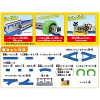 直線レール(2)、曲線レール(14)、1/2直線レール(1)、1/2ストップレール(1)、1/4直線レール(凸凹)(2)、1/4直線レール(凸凸)(1)、1/4直線レール(凹凹)(1)、ターンアウトレール(L・R)各(1)、Y字ポイントレール(A・B)各(1)、踏切ベース(1)、警報機(2)、遮断かん(2)、駅(1)、トンネル(2パーツ)(1)、シール(1)