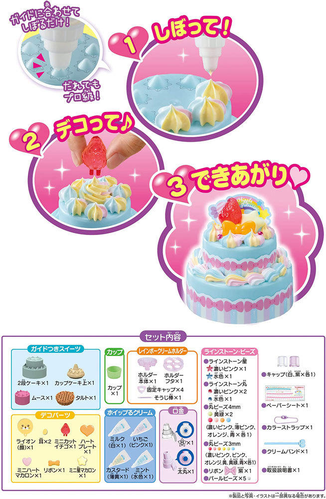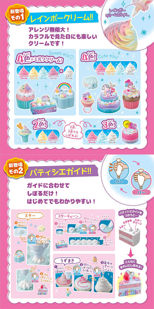 4色のクリームが一度にしぼれちゃう「レインボークリームホルダー」と上手にしぼれる「パティシエガイドつきスイーツ」が入ったセットだよ。 ポップでカラフルなスイーツがつくれちゃう! クリーム4本と口金2種、スイーツパーツも全て入っているから、これだけで遊べるよ。