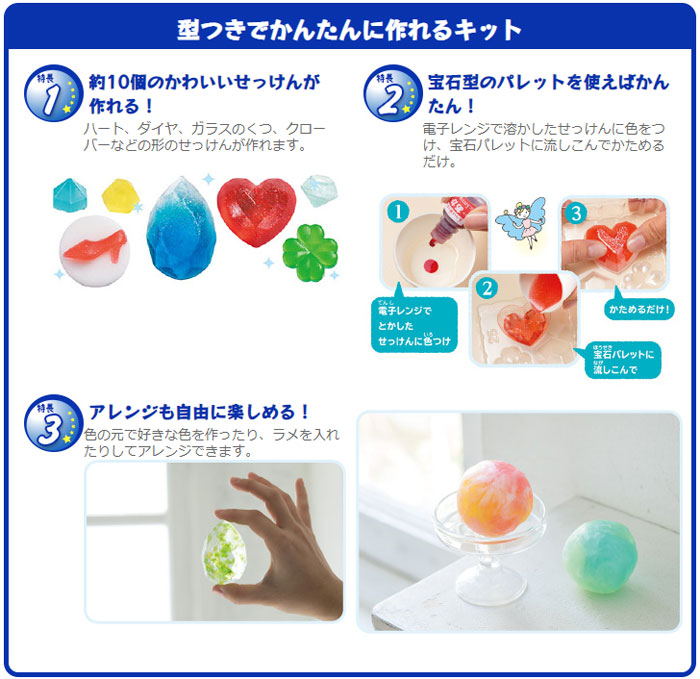 宝石みたいなせっけんが、かんたんに作れるキット。 電子レンジでせっけんをとかし、好きな色をつけ、かためればできあがり! 型つきで、誰でもかんたんに、10種類約10個のきらきら宝石せっけんがつくれる。 プチナイフ・型と宝石レシピブックつき。
