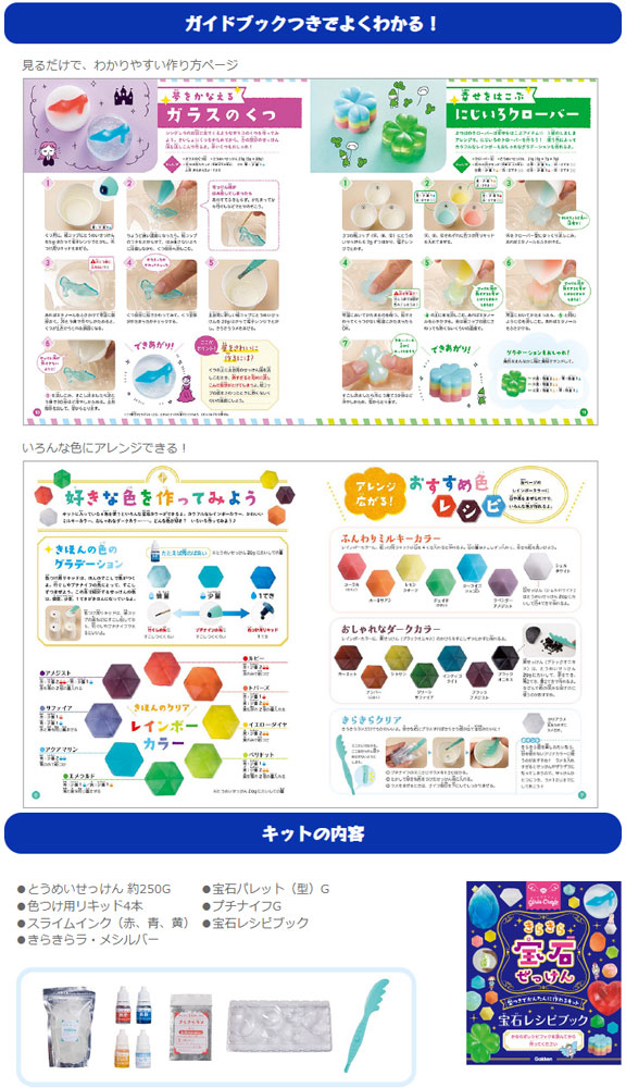 【キット内容】 ●とうめいせっけん 約250G ●色つけ用リキッド4本 ●スライムインク(赤、青、黄) ●きらきらラ・メシルバー ●宝石パレット(型)G ●プチナイフG ●宝石レシピブック