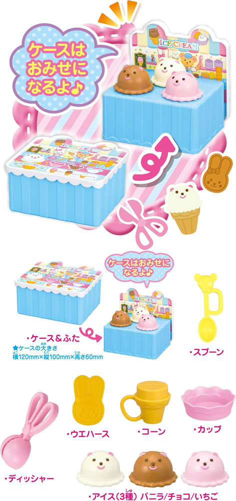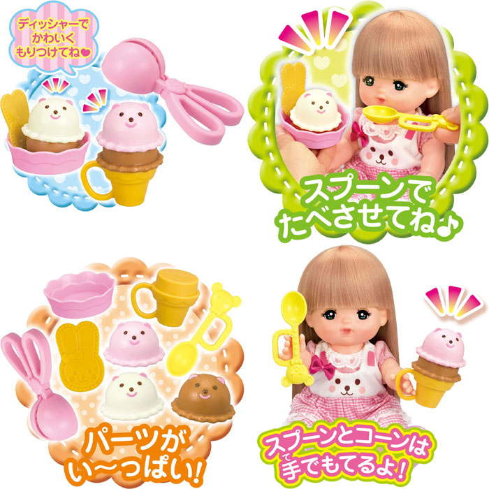 メルちゃんとアイスやさんごっこしましょ カップやコーンにディッシャーでかわいくアイスをもりつけてね。 アイスは、バニラ・チョコ・いちごの3種類。