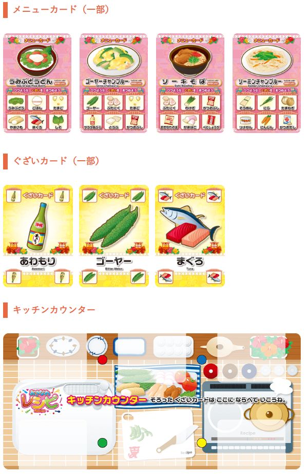 ご当地レシピシリーズ第二弾『おきなわレシピ』が登場! 誰もが憧れる観光地・沖縄といえば“ゴーヤーチャンプルー”や“おきなわそば”はもちろん、地元でも愛されるソウルフード“タコライス”や郷土料理の“どぅるてん”など、食べたことのあるお料理から知らなかったお料理までズラリと8種類揃った“おきなわレシピ”。沖縄ならではの「ぐざい」も新たに登場し、沖縄料理を知ることができます!ご家族揃って、沖縄に行った気分でお楽しみください!