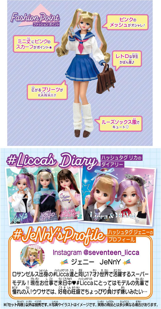 #Liccaのフレンドドールとして復活した#ジェニーの待望の制服ドールが登場!セーラー服をキュートに着こなします。 セーラー服に、ルーズなレッグカバーや学生カバンで平成レトロ感をミックス! ブロンドにピンクのメッシュが入ったツーテールヘアで、ジェニー流に日本のカワイイ女子高生スタイルを着こなします。