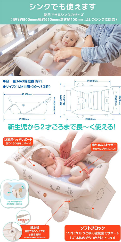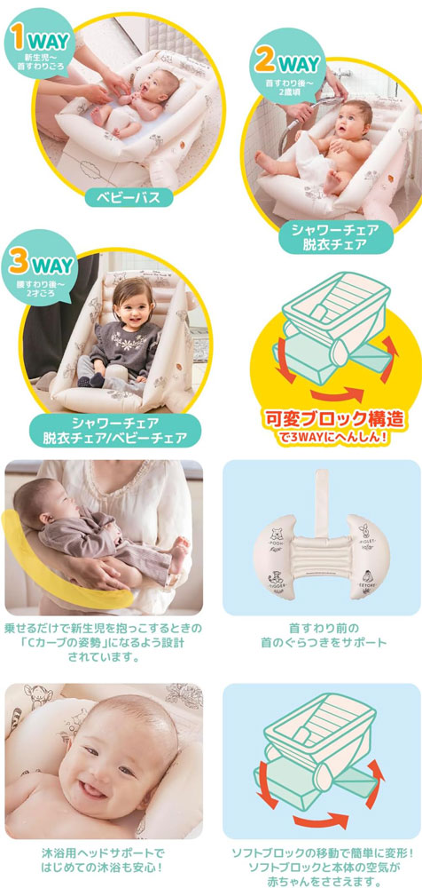 新生児の「沐浴」から2歳頃まで。 ベビーバスがベビーチェアにへんしん! 3WAYに簡単変形で長く使えるくまのプーさんのベビーバス! 【対象年齢】0ヶ月〜2歳頃 【可変ブロック構造で3WAYに簡単変形】 ・1WAY(沐浴用ベビーバス):0ヶ月〜首すわりごろまで 生まれたばかりの沐浴に。シンクでもお風呂場でも使用できます。 ・2WAY(シャワーチェア、脱衣所チェア):首すわり後〜2歳頃まで 腰座り前のお座りをサポートして、シャワーチェアや脱衣所での赤ちゃんを少し待たせる椅子としても使うことができます。 ・3WAY(シャワーチェア、脱衣所チェア、ベビーチェア):腰座り後〜2歳頃まで 腰がしっかりして来たら、ベビーチェアとしても使用できます。 【商品のポイント】 ・専用空気ポンプ付き ・シンクでも使えます。 ・ソフトブロックと横の空気室でサポートして本体のぐらつき防止します。 ・沐浴用ヘッドサポート付き:はじめての沐浴も安心! ・排水栓:浴室でもシンクでも水抜き簡単♪ ・乗せるだけで新生児をだっこするときの「Cカーブの姿勢」になるよう設計されてます。 ・ぶら下げて乾かせる吊り下げフック穴付き ・便利な排水栓付きだから水抜きも簡単 ■メーカー:タカラトミー(TAKARATOMY) |
