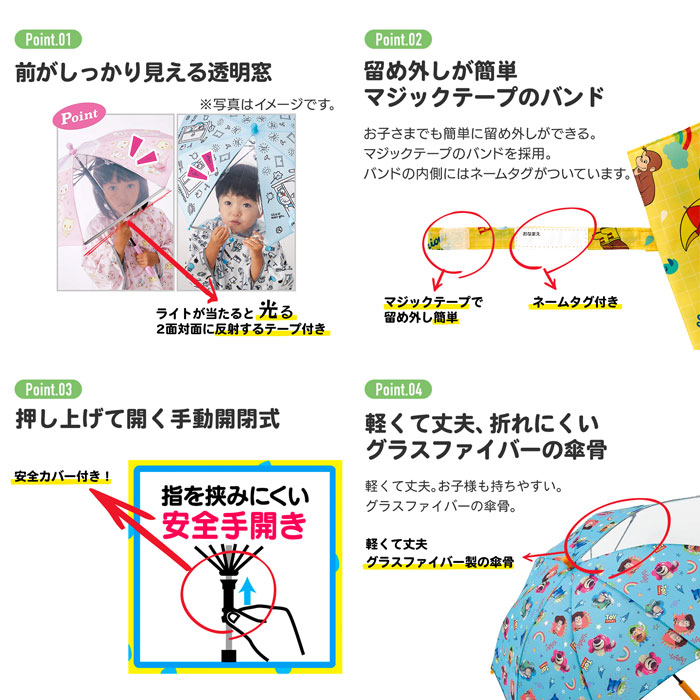 傘骨は軽くて丈夫で折れにくいグラスファイバー。 透明窓付きで前がしっかり見えて安心。 車のライトを反射するテープ付き。