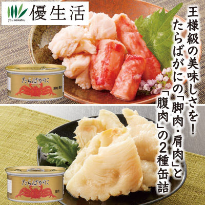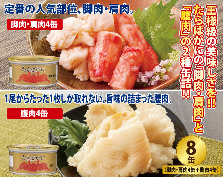王様級の美味しさを!!たらばがにの「脚肉・肩肉」と「腹肉」の2種缶詰!!