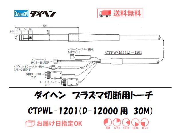 【ダイヘン(DAIHEN)純正部品】 ダイヘン(DAIHEN) エアプラズマ切断用トーチ CTPWL-1201(ストレート形) 30M(D-12000用)です。シンプルで優れた耐久構造になっています。軽量だから操作性も抜群です。また接続もワンタッチでOK、握りやすいトーチボディ、不用意にトーチスイッチが入らない等作業性に優れた切断トーチとなっています。