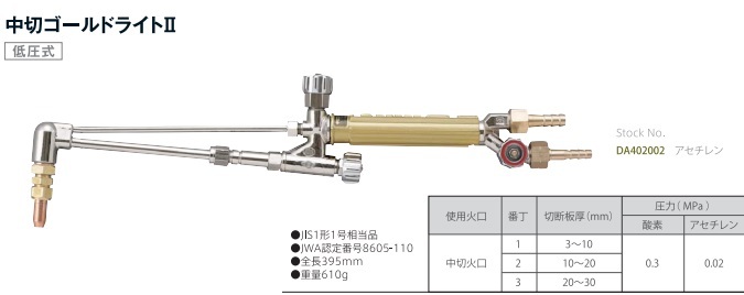 小池酸素 中切ゴールドライト2 ガス切断器 本体+火口3本付 アセチレン+酸素対応 中型切断器 低圧式 溶断トーチセット(No.1/No.2/No.3)