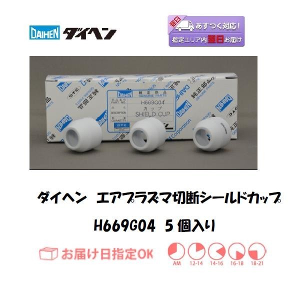 【ダイヘン(DAIHEN)純正部品】ダイヘン(DAIHEN) エアプラズマ切断シールドカップ H669G04 5個です。 ダイヘン(DAIHEN)純正のシールドカップは特殊加工を施しているため、耐久性が抜群です。