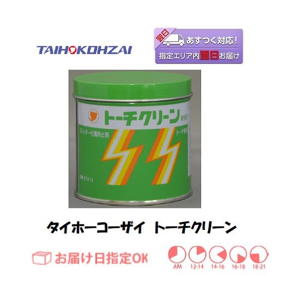 タイホーコーザイ トーチクリーン 300gです。トーチクリーンは、時代の先端を行く溶接ロボットや、全ての自動、半自動溶接機のウィークポイントを解消し、高能率、高精度の作動をはかるため開発した新しいタイプのトーチ用スパッター付着防止剤です。