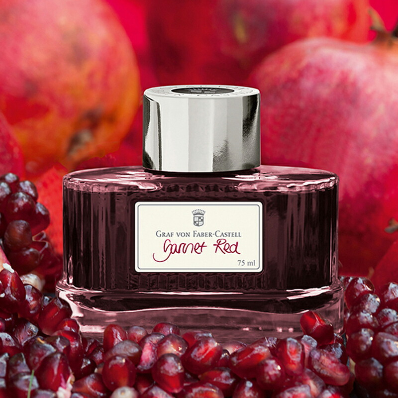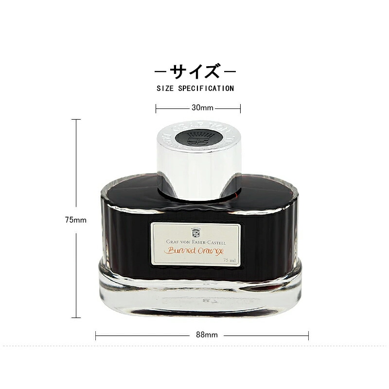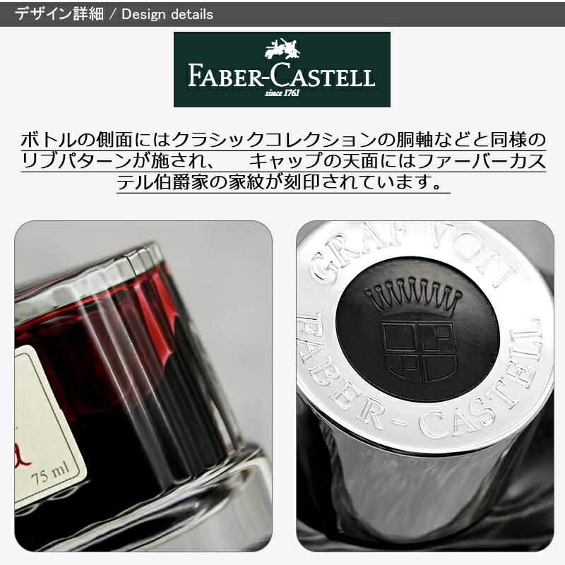 【商品説明】ボトルの側面にはクラシックコレクションの胴軸などと同様のリブパターンが施され、キャップの天面にはファーバーカステル伯爵家の家紋が刻印されています。エレガントな小瓶は、厚底で安定感があります。